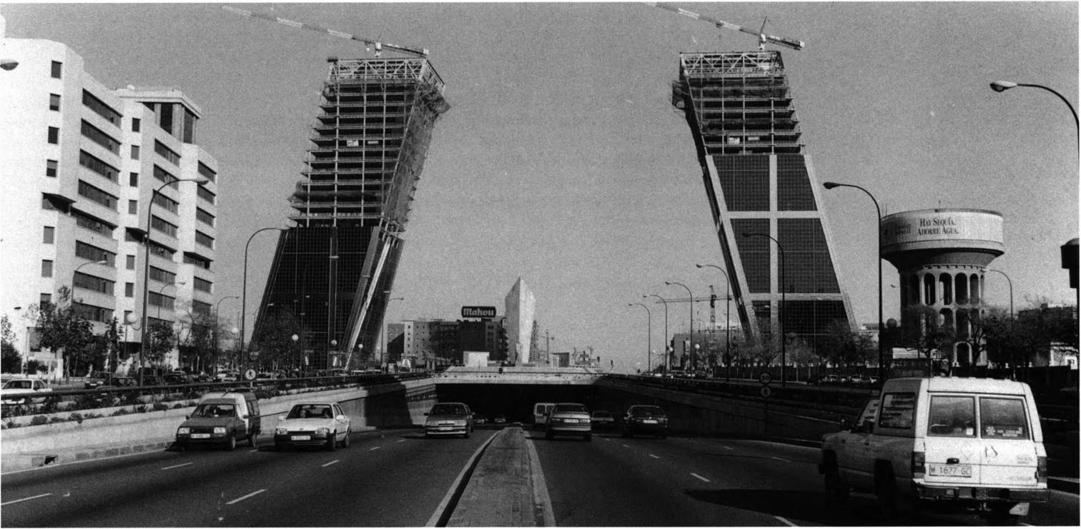 Al final del paseo de la Castellana, las torres gemelas rematarían el eje norte-sur de la ciudad conformando una puerta alegórica en el camino que conduce hacia la Europa de la prosperidad. Su inclinación recíproca esbozaría el gesto de cierre de ese arco triunfal, cruzándose imaginariamente en el espacio como cruzan sus sables los compañeros castrenses del recién casado. Las bodas de España con Europa tendrían su expresión feliz en dos torres escoradas que rendirían homenaje simultáneo a la proeza técnica y a la sensibilidad descoyuntada y diagonal de los últimos ochenta. Esos prismas inclinados se recortarían en el perfil de Madrid como un rasgo inconfundible y, olvidadas las polémicas, serían tan admirados y queridos como es hoy la Tour Eiffel, otro alarde constructivo incomprendido en su tiempo.