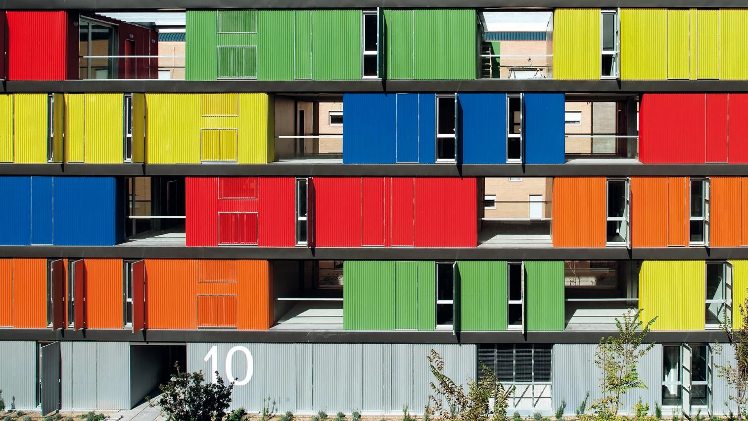 En la avenida de la Peseta, eje del nuevo ensanche del barrio madrileño de Carabanchel se alza un bloque semejante a un apilamiento de contenedores metálicos de colores brillantes. Se trata de las 82 viviendas de protección pública construidas por el estudio de Andrés Cánovas, Atxu Amann y Nicolás Maruri para la Empresa Municipal de la Vivienda y Suelo de Madrid, tras ganar el concurso en 2003. El edificio, de planta rectangular, es un bloque perimetral de crujía mínima —apenas ocho metros— en el que cada célula-vivienda cuenta con un espacio abierto previo, inspirado en el Inmueble-Villa de Le Corbusier. El exterior de cada unidad se presenta como una carrocería de chapa, siendo en realidad una fachada trasventilada cuyos huecos se mimetizan mediante contraventanas perforadas. El patio de la manzana participa del espacio público exterior y la planta baja cuenta con zonas comunes.