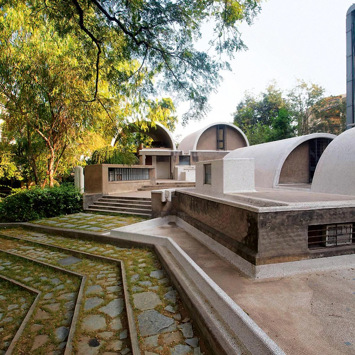 Almost 20 years later, the hollow tile roof from PRL housing made a successful comeback in the form of more refined vault structures of Doshi’s own office, named Sangath, which means moving together on a journey or a pilgrimage. More than an office, it is a place for exchanging ideas. A beautifully landscaped garden, comprising an intimate amphitheater where often the staff can be seen having tea and snacks as if in a public park. The studio space feels monastic; a barrel vault is interrupted in places to stack volumes and allow clerestory light into the workspace; the outside of the vault is covered in broken shards of china mosaic and is sculpted to naturally collect and channel rainwater. The entire experience is calming and magical.