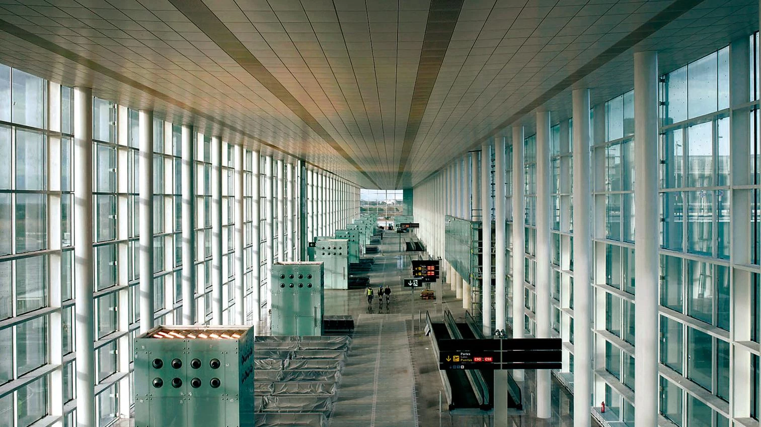 El pasado mes de junio se inauguró la nueva Terminal 1 del aeropuerto de Barcelona, en El Prat del Llobregat, firmada por Ricardo Bofill, quien también diseñó las anteriores remodelaciones. Se trata de la mayor infraestructura construida en Cataluña en las dos últimas décadas, un complejo de 550.000 metros cuadrados con capacidad para 30 millones de viajeros anuales (55 si se suman los de la Terminal 2) y hasta 90 operaciones cada hora. La terminal se organiza alrededor de tres grandes elementos: un edificio procesador que aloja la facturación, la recogida de equipajes y la zona comercial del lado aire (de 24.000 metros cuadrados y denominada La Plaza); dos diques laterales y uno longitudinal dedicados a zonas de embarque de pasajeros; y un vestíbulo intermodal donde confluirán los distintos sistemas de transporte —en el futuro llegará el metro y el tren de Cercanías—, conectado con dos silos de aparcamiento que suman 9.400 plazas. Entre los rasgos más destacables del interior está la abundancia de iluminación natural y la variedad de los espacios, pensados para hacer más agradables las esperas aeroportuarias.