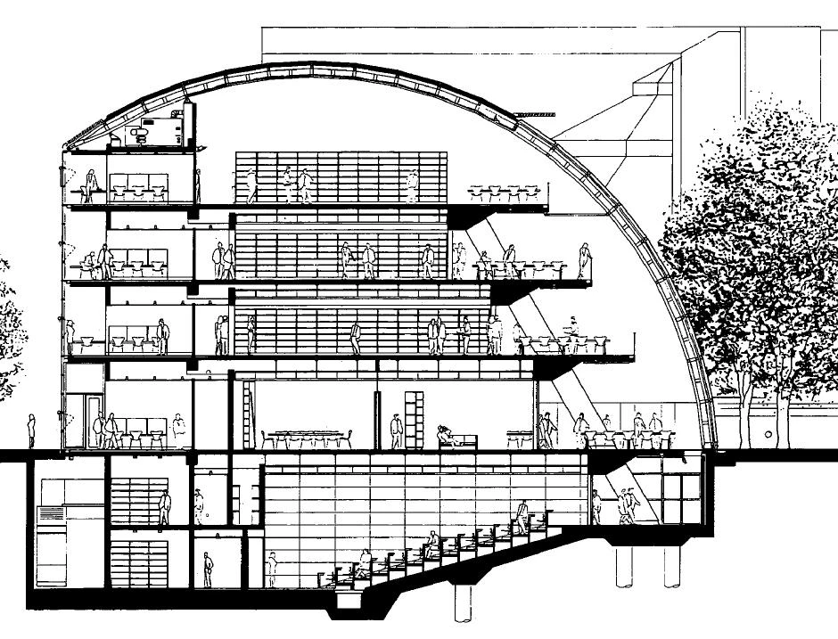 Solutions tried in previous projects have been employed in the airport on an incomparably larger scale. Left, a cross section of the Faculty of Law at Cambridge University.