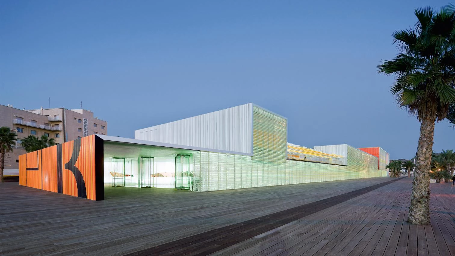 Proyectado por José Selgas y Lucía Cano, el nuevo auditorio de Cartagena da cuenta de la condición longitudinal de su enclave, un antiguo muelle vinculado al puerto, y colonizado ahora por un amable paseo urbano. El edificio hospeda su complejo programa en un volumen compacto y extruido, sólo alterado por los cambios de sección y de color, y definido por el uso de materiales livianos que, a la par que contrastan con el carácter pétreo y macizo de los muelles, evocan con su atmósfera translúcida la condición mudable de la superficie del mar.