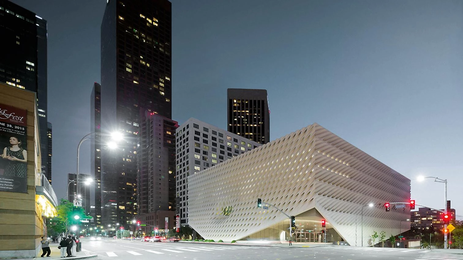 Intended to house one of the largest existing private collections of contemporary art in the world, owned by the American entrepreneur and philanthropist Eli Broad and his wife, Edythe, the building – dubbed ´the veil and the vault’ – stands very close to Frank Gehry’s Walt Disney Concert Hall, home to the LA Philharmonic. The proximity of the WDCH building determines the Broad project in that without denying itself an iconic stature, it takes on the image of an abstract skin of rigorous geometry and organic lines. So the new museum’s total of 11,000 square meters distributed in three floor levels are given an enclosure that functions as loadbearing structure and as ornament at the same time. The structural lattice frees up the ground level and makes it possible for its contact with the ground to be an event in itself, welcoming the visitor into the foyer. As for ornament, the 2,500 rhomboidal pieces of fiberglass-reinforced concrete filter daylight coming in from the street, while shielding the gems contained within this faceted white jewel case hidden from the gaze of outsiders.