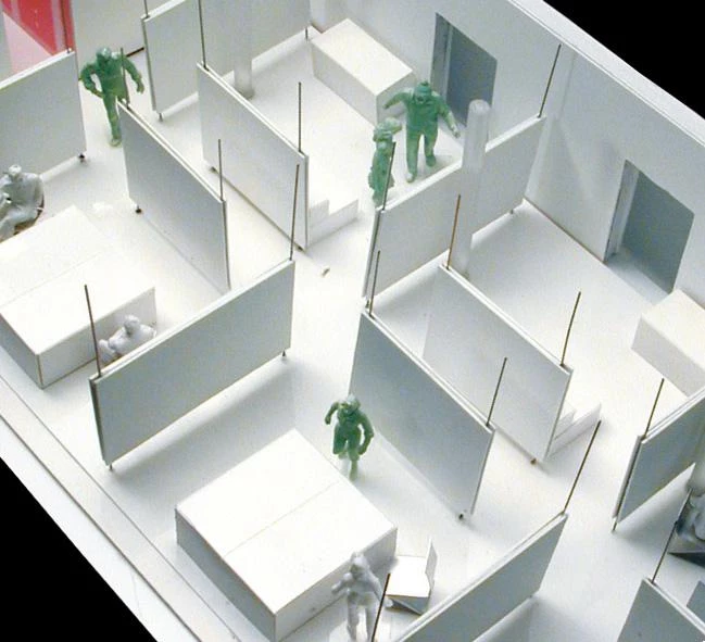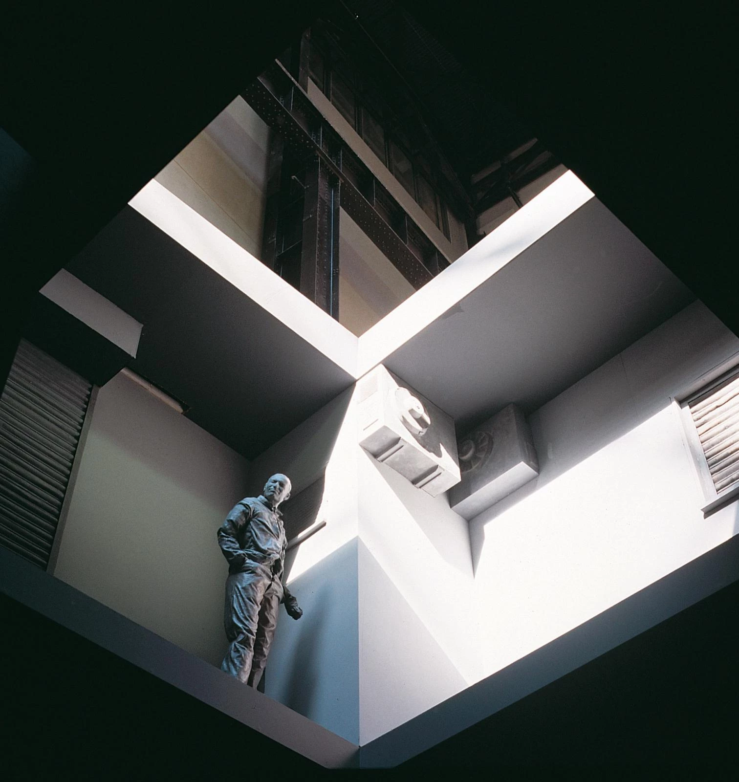 Admirably in dialogue with the building refurbished by the Swiss partners Herzog & de Meuron, Juan Muñoz’s installation refers as well to the architectural explorations of another hyperactive cosmopolite, the Dutch Rem Koolhaas, with whom he shares an ambitious penchant for the large scale, a theatrical way of manipulating sections, and the ambiguity of working in the critical cracks of art and commerce.Whether the translucent floors of the Rotterdam’s Kunsthal, the mobile platform of his Bordeaux house, the wide pit of the Guggenheim of Las Vegas or the immobile labyrinths of the projects for the fashion firm Prada, the spaces built by Koolhaas are inhabited by a multitude of foreshortenedcharacters that are not difficult to relate to the self-withdrawn figures of Muñoz, closer to the anodyne anonymity of the boxes of figurines constructed at the scale used by the architect in his models, than they are to the social-realist severity of George Segal, the painstaking lyricism of the Madrid artists Antonio and Julio López or the sensationalist provocation of the Chapman brothers.