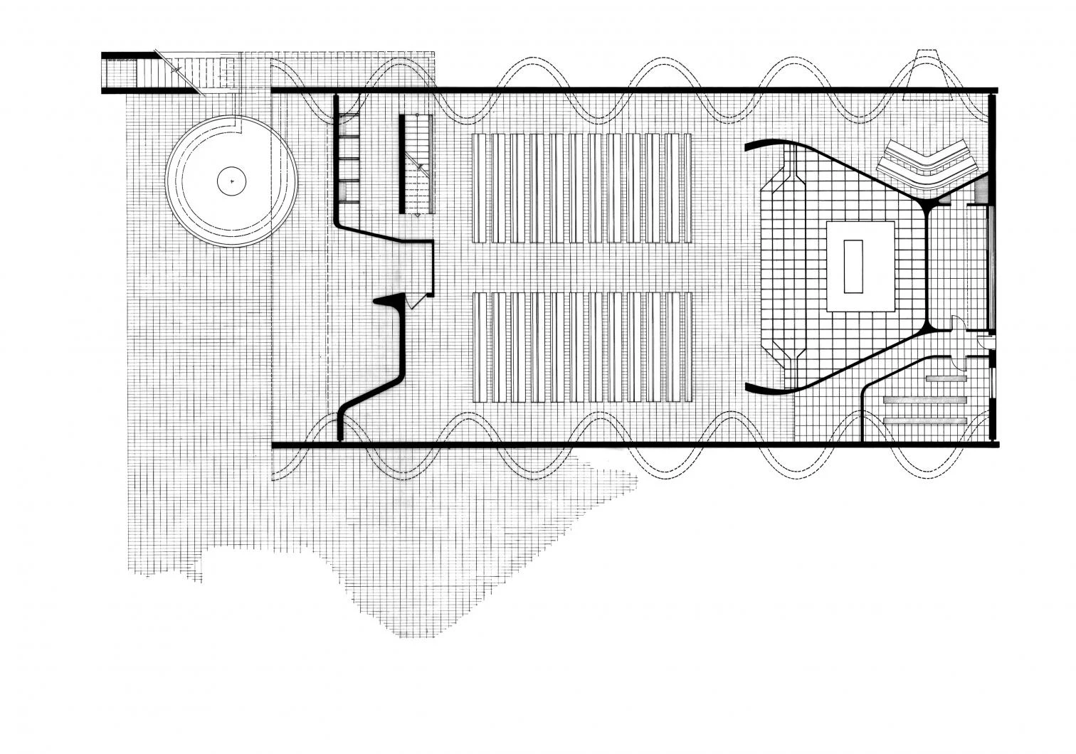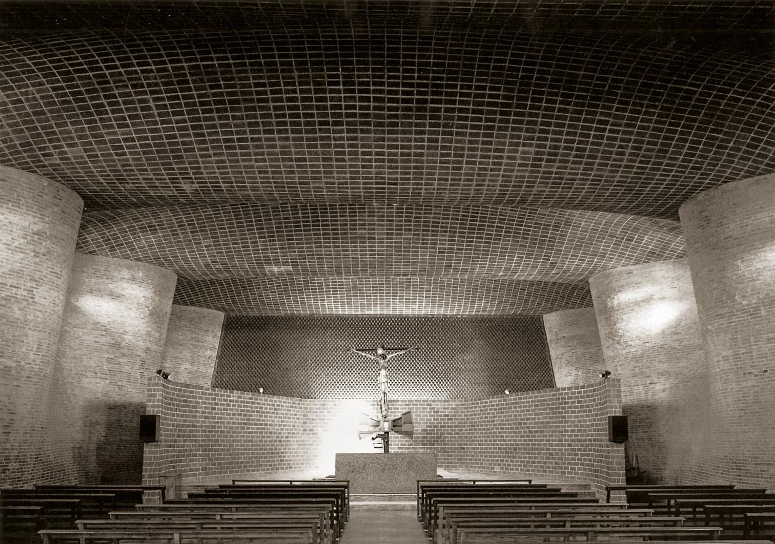 In articles, lectures, and project descriptions Dieste allowed no doubts about the priority he gave to the unit of space in the conception of the church. The floor plan shows a composition of heterogeneous fragments arranged along the nave. Besides the structure and the material quality, the penumbra is what gives unity to an isolated inner world. The little light that enters seeps in through small openings with fixed pieces of colored glass and translucent onyx that block out views of the exterior. Low lights on the facades, overhead lighting, and backlit compositions against the light carefully shine on the main liturgical spots and help create a mystical atmosphere that Dieste identified with the manifestation of the divine mysteries..