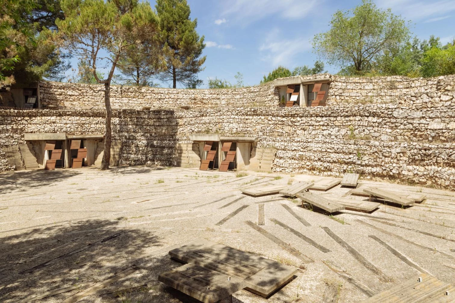 The rites of passage between life and death are acted out on a stage where architecture blends with nature. Because “a cemetery is not a tomb; but it is better said to be a relationship between landscape and the oblivion.” In the concave site of a former quarry, the earth has been modelled, and the walls of the enclosure are either constructed with the same material extracted from the excavation and bound with metallic mesh, or with rows of niches which have concrete walls that open like petals of stone flowers. They all outline a solemn route that, paved with logs embedded in concrete, resembles the flow of a stationary river. The rusty gates of the mausoleums also participate in the static choreography of this eternal, silent garden city – one which is altered only slightly by the change and growth of vegetation and the gradual passing of time.