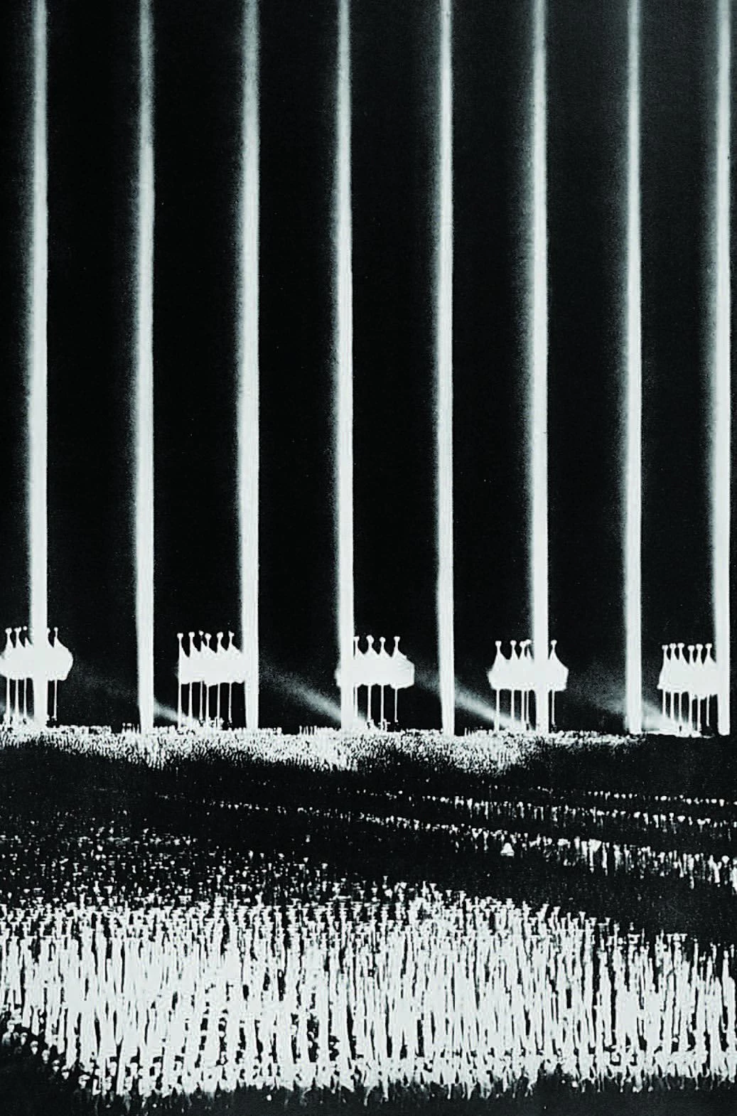 The ghostly shafts of light over the sky of Manhattan convene other specters of a sinister past: Albert Speer’s ‘Cathedral of Light’ for Nuremberg, designed in 1934 as the stage for the Nazi Party mass parades and rallies.