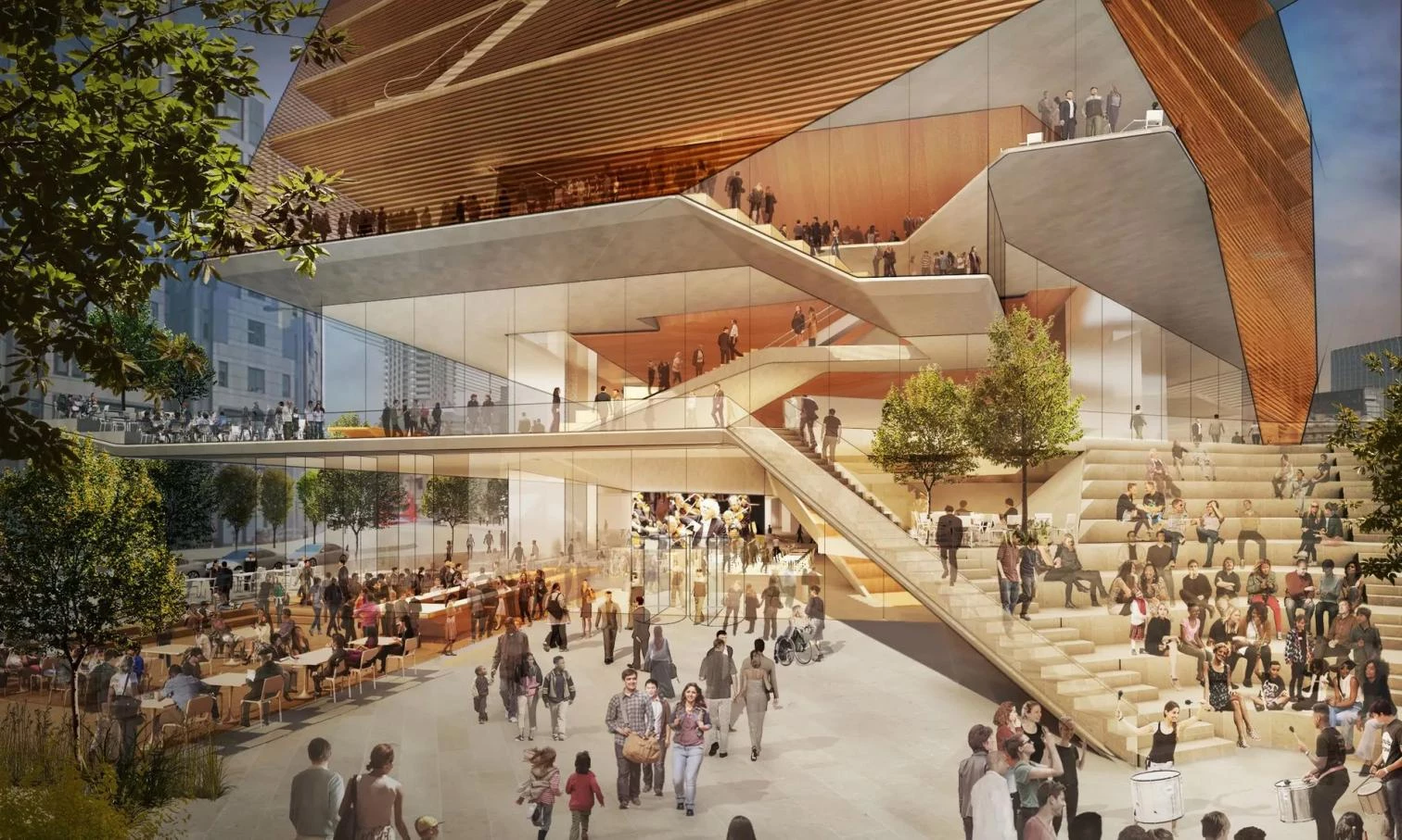 The site will include a pedestrian plaza and foyer, with the concert hall above. Images: AFP/Getty Images