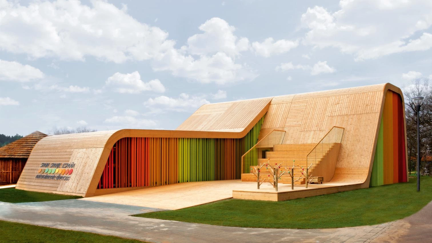 El pabellón español, proyectado por el equipo madrileño Pulgón Diseño en colaboración con Nussli, se ha desarrollado a partir de conceptos de sostenibilidad inspirados en el llamado cradle to cradle, es decir, el diseño ecológico basado en el cierre del proceso de reutilización de los materiales de forma que no se generen residuos, y en la integración de energías renovables en la arquitectura. Con este fin, gran parte de los materiales con los que se ha construido el pabellón han sido utilizados anteriormente con otros usos: madera de cajas de frutas, tablones de obra, restos de productos agrícolas, troncos de árboles quemados o cañizo utilizado en instalaciones hortícolas y en la construcción tradicional.