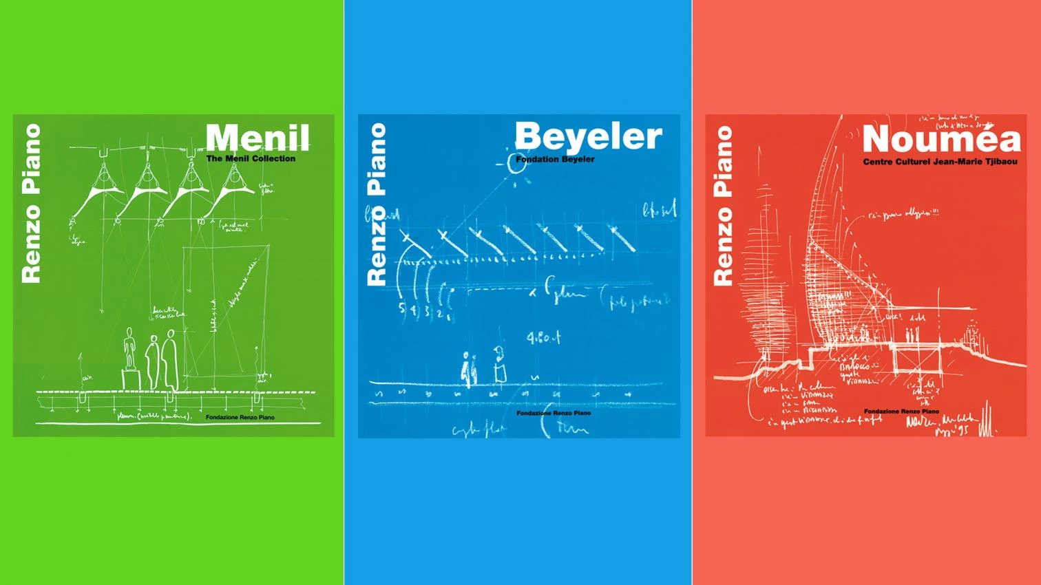 Renzo Piano creó en 2007 una fundación que tiene por propósito preservar sus archivos, pero también promover, entre los jóvenes arquitectos, su idea de la formación en bottega: un taller en el que los inexpertos aprenden de los veteranos a través del trabajo en común, y donde la arquitectura pueda reencontrarse con el placer de hacer cosas con las manos. La Fondazione está ubicada en Génova, al pie del escarpado estudio que el arquitecto construyó entre 1989 y 1991 en Punta Nave —una secuencia de terrazas cubiertas de vidrio sobre un acantilado que domina el mar de Liguria—, y ocupa un viejo hotel de playa transformado para adaptarse a sus nuevos usos: residencia de estudiantes en prácticas, salas de exposición, archivo y zonas de reuniones. Esta joven institución ha iniciado también un ambicioso proyecto editorial, dirigido por la hija del arquitecto, Lia Piano, y aquí se muestran los primeros frutos de este empeño, tres monografías de gran formato que documentan con exquisita minuciosidad tres obras maestras del genovés: la Colección Menil en Houston, la Fundación Beyeler en Basilea y el Centro Cultural Jean-Marie Tjibaou en Nouméa se describen con gran número de croquis y planos, innumerables fotografías, correspondencia con los clientes y recortes de periódico suscitados por la apertura, amén de extensas entrevistas con Renzo Piano que explican en detalle las circunstancias del encargo y las intenciones del proyecto. Desde las cartas de Dominique de Menil o Ernst Beyeler hasta las notas de Glenn Murcutt sobre el jurado de Nouméa o el relato de la relación con Marie-Claude Tjibaou, la viuda del líder nacionalista canaco asesinado que dio nombre al centro, y hasta la multitud de dibujos, maquetas y modelos a escala natural que sirvieron para levantar estas tres grandes obras culturales, pasando por la documentación ambiental, botánica, artística o antropológica que se utilizó como inspiración de los proyectos, los libros son archivos encuadernados a los que habrá de remitirse cualquier investigación futura. Con ellos la Fundación comienza a dar los primeros pasos, que son a la vez zancadas y susurros, porque consiguen avanzar un gran trecho sin que su considerable dimensión haga perder el tono íntimo que, desde Texas y Suiza hasta Nueva Caledonia, nos transporta en sordina por los tres continentes.