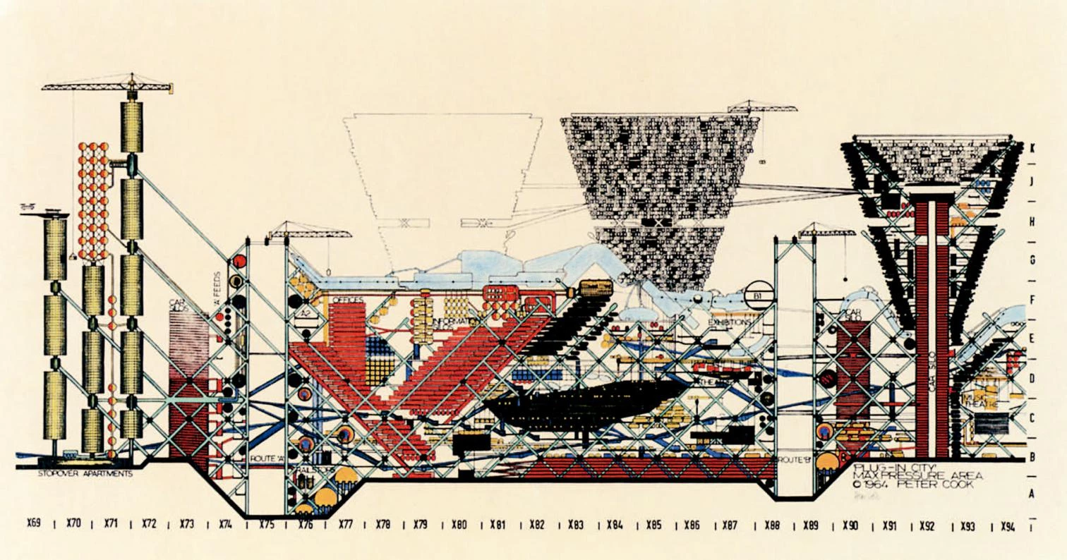 British counterculture produced techno-hedonist visionary architectures as influential as the Fun Palace of Cedric Price in 1959-1961 (above) or as the Plug-In City by Archigram’s Peter Cook in 1962-1964 (below).