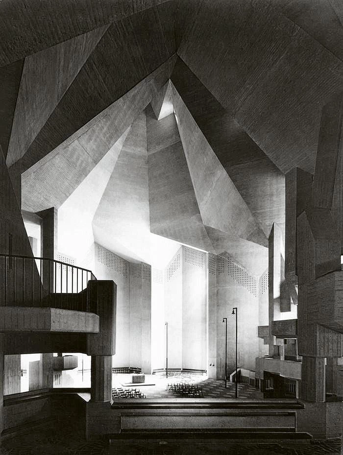 The success of this opera prima – small but with huge social and cultural repercussions, and now respectfully integrated into the Archdiocese of Cologne’s Kolumba Museum, as renovated by Peter Zumthor – began a period of exploring the architectural potential of hanging membranes. The experiment led to some articles of a theoretical sort that elicited critiques by Frei Otto in his published dissertation, Das hängende Dach (1953). To be sure, Böhm was not so much interested in structural optimization as he was looking for new attributes, and this comes to the fore in brilliant works of those years, such as St. Albert in Saarbrücken (1951-53), with the elegant vaulted sheet of its roof, suspended among organic buttresses, or St. Paulus in Velbert (1953-55), with its interplay of penetrations of hanging membranes and transparent volumes. Considering such relish for the lightweight and rational, it is hard to believe that barely a decade later, precisely in Velbert, in the hamlet of Neviges, he built its architectural antithesis: the crystalline block of carved concrete of Maria Königin des Friedens Church (1963-73), without a doubt his most acclaimed work but also the most criticized, given its archaic monumental boldness in times of technological and social revolutions.
