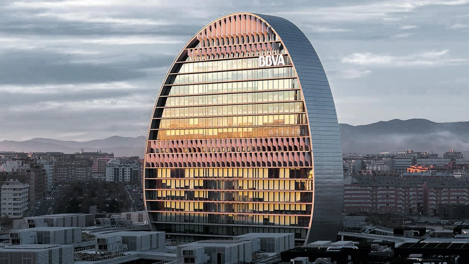 The Madrid neighborhood Las Tablas now features a campus or ‘city’ of the banking conglomerate Banco Bilbao Vizcaya Argentaria (BBVA). Its nickname, meaning ‘the sail,’ refers to the shape of the vertical construction that lords over the entire estate. Designed by the Swiss partnership Herzog & de Meuron, the complex consists of seven horizontally set buildings rising three floors and separated by narrow courtyards,which give the plinth of offices the appearance of a kasbah, and an upright volume 93 meters tall which, though iconic enough to give the premises a name, contains less than a tenth of the overall built space. Seen from many parts of the city of Madrid, this unusual structure of concrete, glazed and lined with a ring of stainless steel, competes in visibility with the four skyscrapers at the football club Real Madrid’s former Sports City. Its characteristic shape, which Jacques Herzog compares to a freehand drawing of a circle, is achieved through a combination of thirty-five radiuses of varying curvature. While the BBVA campus is the site of some 6,000 jobs, the tower with its useful width never exceeding 13 meters will only be used by some 300 people, including the banking group’s executive board. The architects’ efforts to situate the BBVA ‘city’ at the forefront of sustainability are commendable: the building presents a sculptural series of protective brise-soleils that will help to keep its thermal inertia stable, the materials used are environmentally low-impact, the facades are strongly insulated (double glazing, inert gas chamber, etc.), and the whole construction is equipped with a sophisticated system for reusing rainwater.
