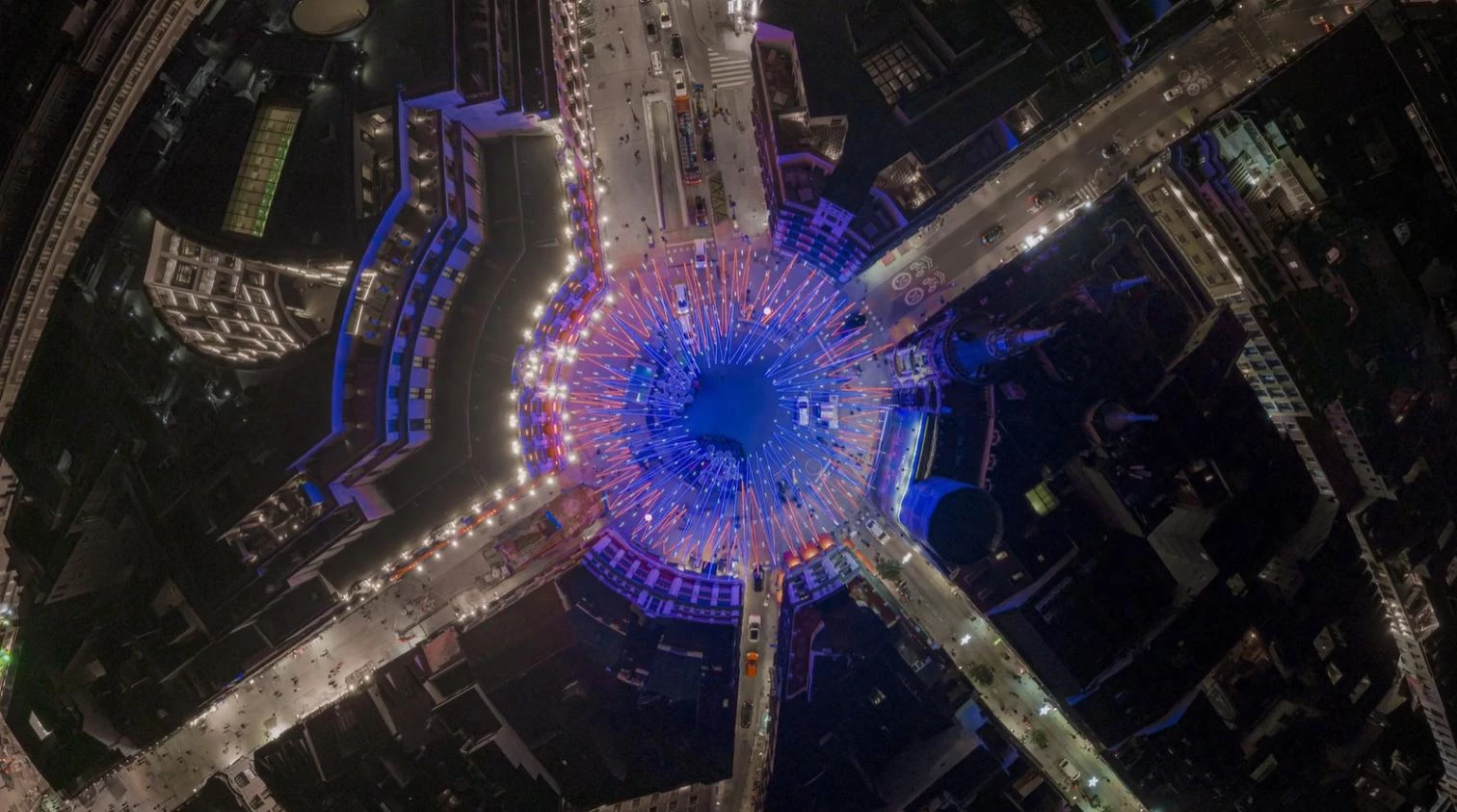 At 9 m above the ground, the mesh of concentric red and blue light rope creates the illusion of a giant iris floating in space. The installation can be understood either as a close-up or vice versa, like the image of a distant galaxy. While the red and blue RGB ropes define the radial grooves, various vertically placed light bulbs and light spheres determine the typical freckles, wrinkles and other disturbances in the iris.