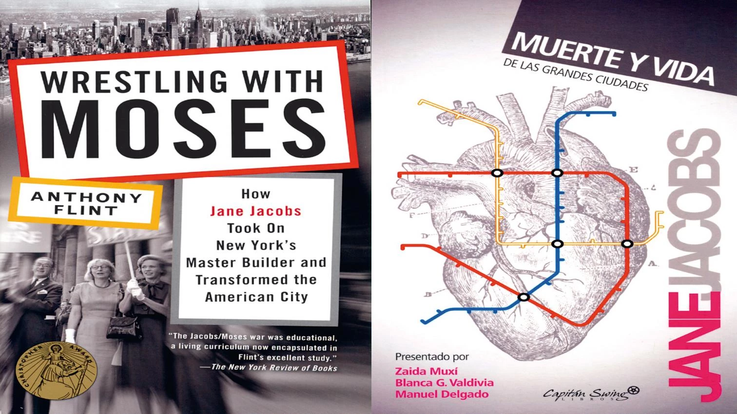 La carrera de Jacobs, sin embargo, no ha sido tan tratada, tal vez por su negativa a autorizar una biografía oficial o su actitud remisa a ser entrevistada. En cualquier caso, ninguna obra había contrapuesto de una forma tan explícita a estas figuras como lo hace A. Flint en Wrestling with Moses, que estructura el relato sobre los conflictos que les enfrentaron: los proyectos de prolongación de la Quinta Avenida a través de Washington Square; de remodelación del Greenwich Village; y de apertura de una vía elevada de 10 carriles trazada a través del denso casco del sur de Manhattan (Lomex). A través de estos episodios aparecen algunos de los temas esenciales en The Death and Life of Great American Cities y de la disciplina urbanística: la primacía de la planificación sectorial frente a un enfoque multidisciplinar integrado; la imposición tecnocrática de planes frente a la participación ciudadana en la elección de objetivos y medios; el surgimiento del movimiento de preservación de la memoria ciudadana y el patrimonio arquitectónico del paisaje urbano tradicional de los centros, frentes a la tábula rasa del urban renewal; el inicio del declive de la preminencia del automóvil frente al transporte público y peatonal en el diseño del espacio público; o la valoración de la diversidad y la densidad de los barrios, frente a la monofuncionalidad del Movimiento Moderno.