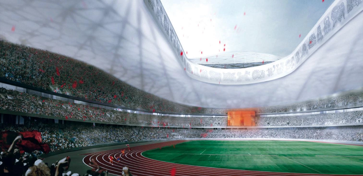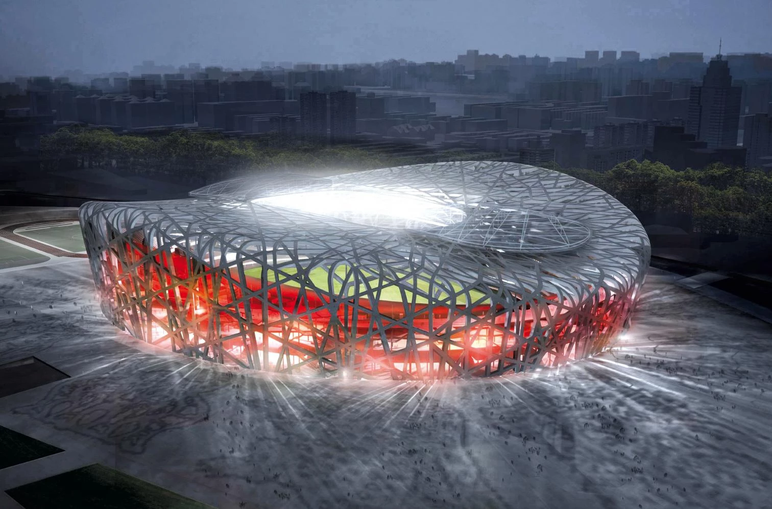 Emblem of the 2008 Games, Beijing’s Olympic Stadium has been conceived as a receptacle of collective celebration; the bowl, with a mesh shaped steel structure, is enclosed by cushions of ethyltetrafluoretylene.