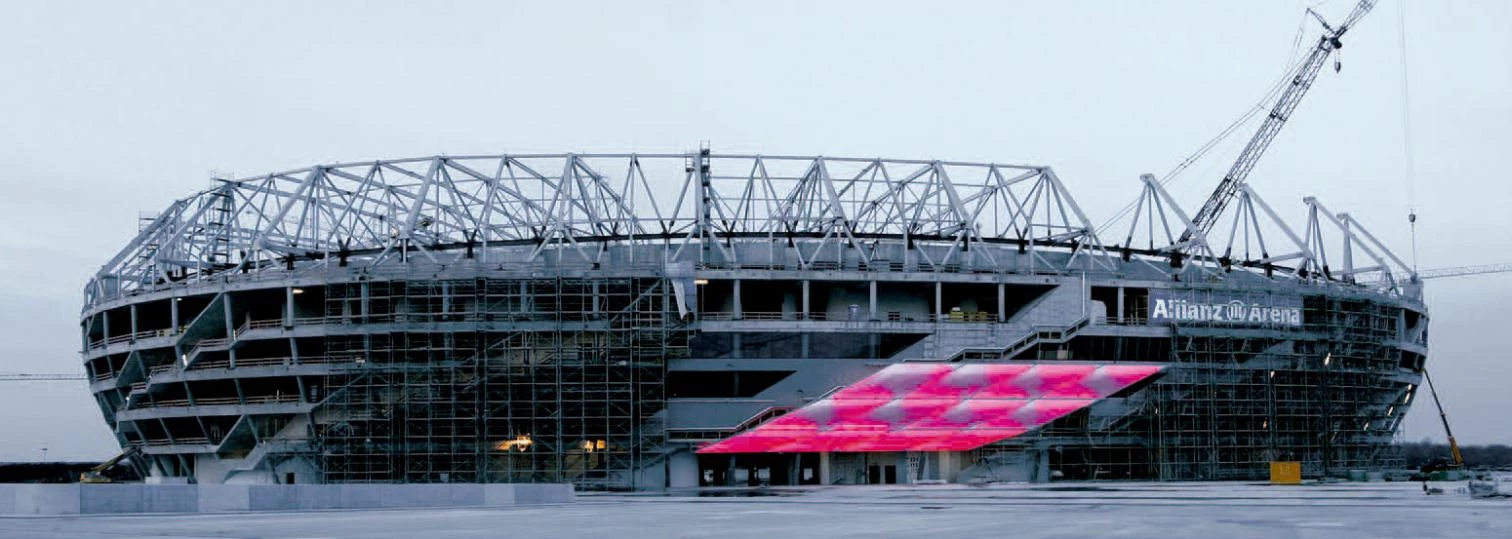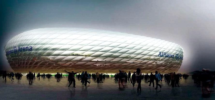 Designed before the Asian project, the remodeling of the Basel stadium (below) and the Munich Allianz Arena also try to monumentalize the public realm, creating luminous urban landmarks.