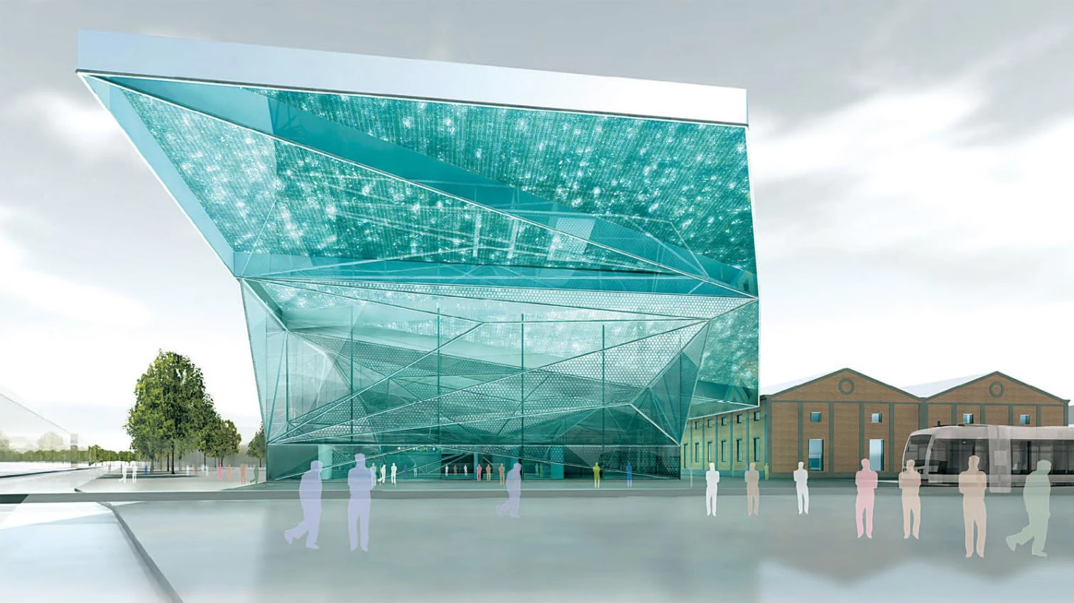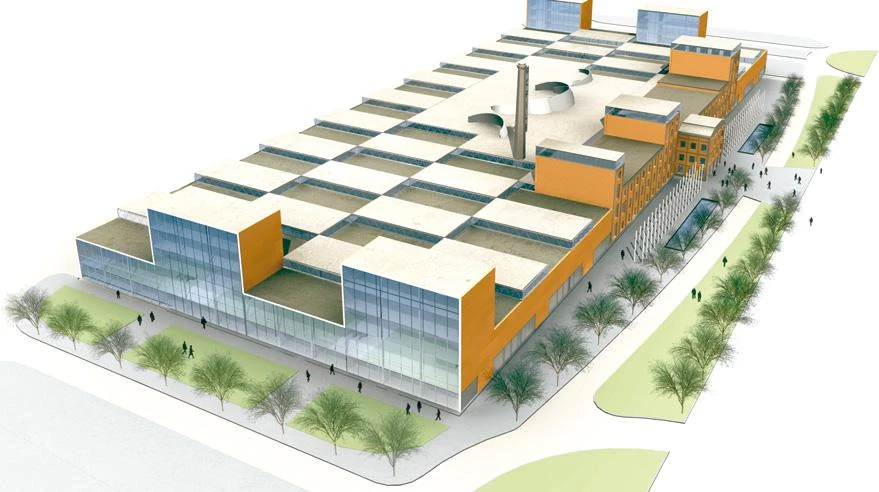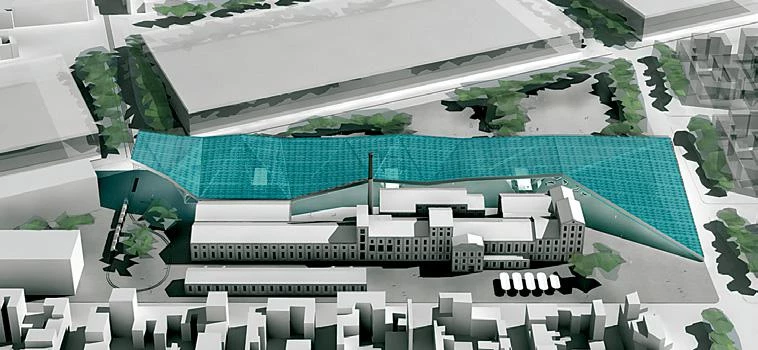 Dominique Perrault’s project for the new Trade Fair and Congress Center stretches a photovoltaic and translucent roof over the buildings of an old sugar mill, heralding its urban presence with a monumental canopy.