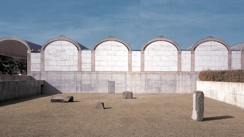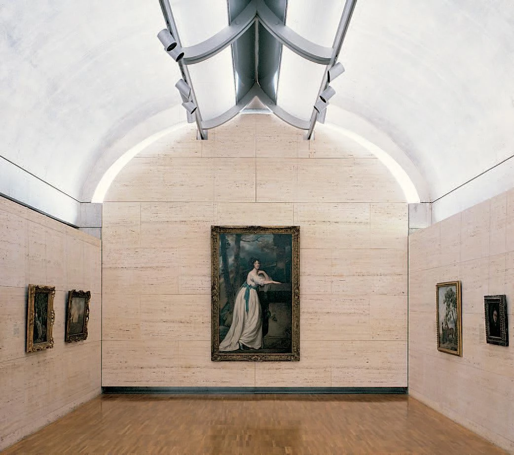 Kahn purified his language further in the later sixties, designing three works of dramatic perfection: the Library of Exeter, a brick cube whose absent corners evoke the Roman ruins he so loved, and where the luminous courtyard’s gigantic oculi of concrete recall the enlightened dreams of Ledoux; the Kimbell Art Museum at Fort Worth, a succes-sion of false vaults of concrete, split by longitudi-nal skylights, which create a timeless and elegant, exquisitely serene atmosphere; and the Yale Center for British Art, situated in front of the Art Gallery that had first earned him recognition twenty years before, an urban prism of concrete, glass and steel that arranges the rooms of the museum around two courtyards characterized by painstaking exactitude and geometric solemnity – which Kahn would never see completed.