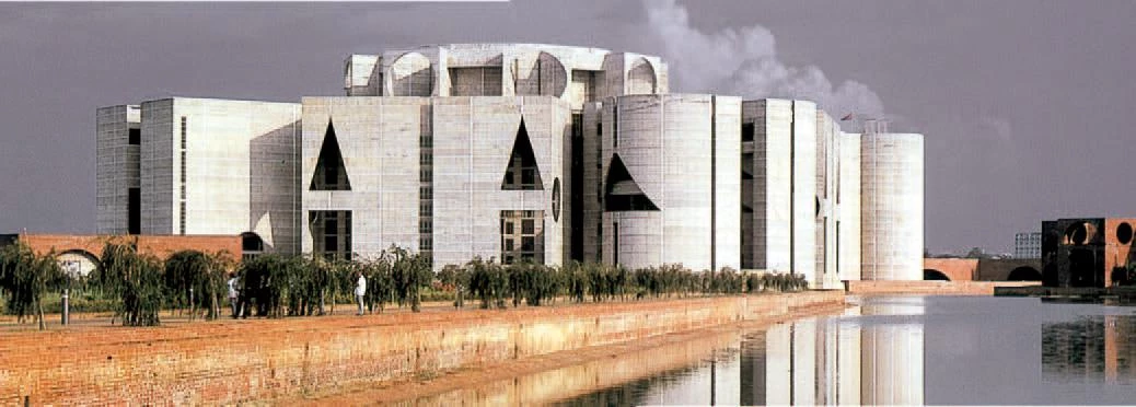 The symbolic power of the Capitol of Dacca (right) lies in its geometric rigor, and that severe formal discipline is the starting point for the dialog with landscape in the monastic premises of the Salk Institute (below).