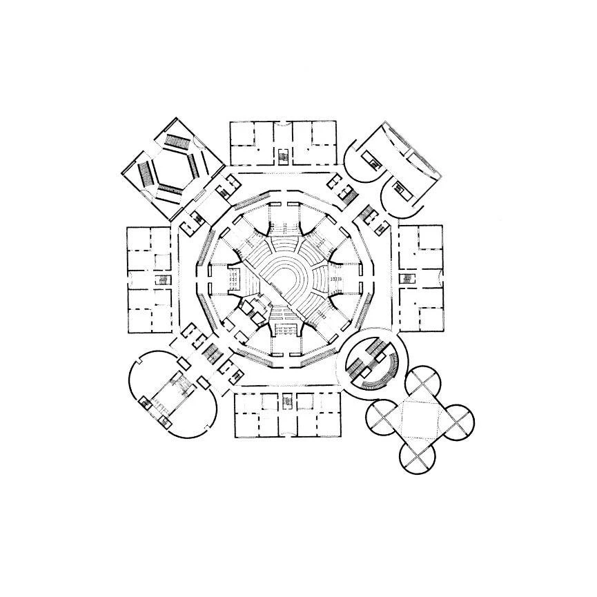 The pyramidal roofs of the Bath House in Trenton, the project in which Kahn claimed to have “found himself”, the medievalist towers of his Richards Medical Laboratories in Philadelphia, where he first materialized his concept of servant and served spaces, and the huge open court opening on to the horizon at the Salk Institute in La Jolla, a science monastery that translates the architect’s obsession with Villa Adriana to a modern language, are three masterworks conceived in the second half of the fifties. The beginning of the sixties in Kahn’s career is dominated by his great Asian projects: the Indian Institute of Management at Ahmedabad and the formidable Capitol center of Dacca (in what later would become Bangladesh), a parliamentary citadel for a young Islamic country built like a fortress of concrete cubes and cylinders perforated by circles and triangles, where the romantic classicism of Piranesian flavor that nourished this phase of his life acquires cosmic resonances.