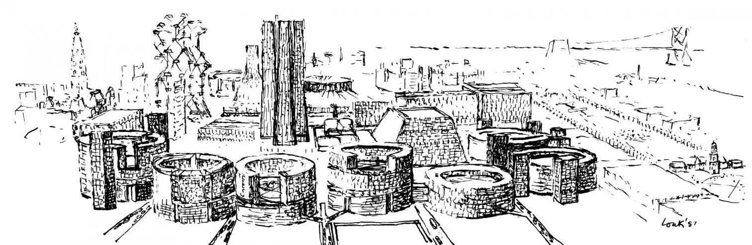 As a student in the University of Pennsylvania, he was fortunate to be in a class under Paul Cret, a distinguished French architect who brought to Philadephia the rigor of the methods of the École des Beaux-Arts of Paris, and in whose office Kahn would work for a while in 1929, after a year-long trip to Europe in which he invested the savings from his first professional employments. The Depression interrupted all ongoing construction, however, and all Kahn got to do in the thirties was collaborate in some of the housing projects undertaken by the administration in the context of the New Deal. He spent much of that decade reflecting and participating in the debate about the future of architecture, maintained by the family of Esther Israeli, a research assistant at the University of Pennsylvania’s Neuro-surgery Department whom he had married in 1930. This period of professional stagnation ended when the United States joined the Second World War and Kahn redirected his career toward social activism and urbanistic projects drawnup with George Howe until 1942 and Oscar Stonorov until 1947, the year he was elected president of the American Society of Planners and Architects (equivalent to the CIAM in Europe), set up his own practice, and began teaching at Yale University.