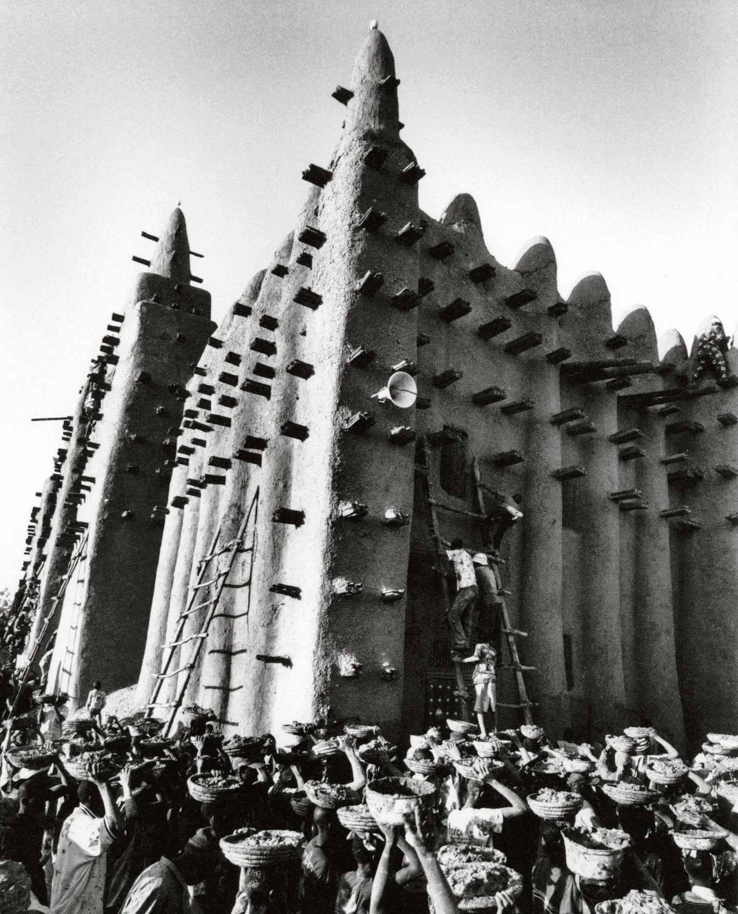 The Great Mosque of Djenné is the world’s most impressive adobe construction, and the most important monument of Sudanese architecture. In the inner delta of the Niger River, Djenné was, like Timbuktu, a hub of Trans-Saharan trade and Islamic knowledge, and the present mosque was raised in colonial times over the ruins of a previous one. Once a year, when the rain season ends, the mosque must repair damage by renovating its facade with banco (a timeless recipe that mixes mud, straw, shea butter, and baobab dust), a task fulfilled in one day by the whole community, and that has become a unique ritual. The archaeologist and photographer Luis Monreal – with whom I was fortunate to travel across those areas of Mali, off limits today due to the presence of an Islamist guerrilla – documents in his latest book the extraordinary regeneration of this living monument, which is reborn periodically in tune with nature.