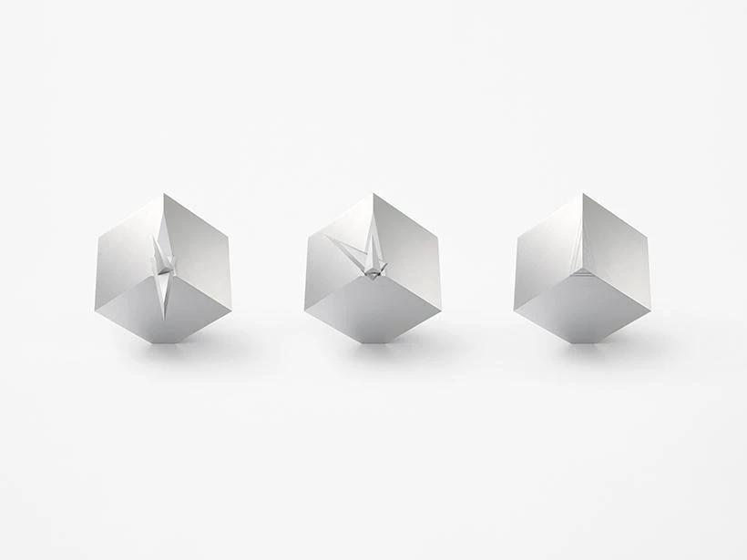 A clock that is designed in the shape of a slanted cube thanks to a sliced-off vertex that allows the clock to balance on its corner. The long and the short hands overlap one another 22 times throughout the day, but only at noon and midnight they will meet in the vertical-upright position and will complete the cube’s shape, as if time is reset after completing a twelve-hour cycle. The functionality of the clock is created by removing and cutting elements of the cube, rather than adding unnecessary parts and materials, resulting in a clock that reveals it’s true form, only twice in a day... [+]