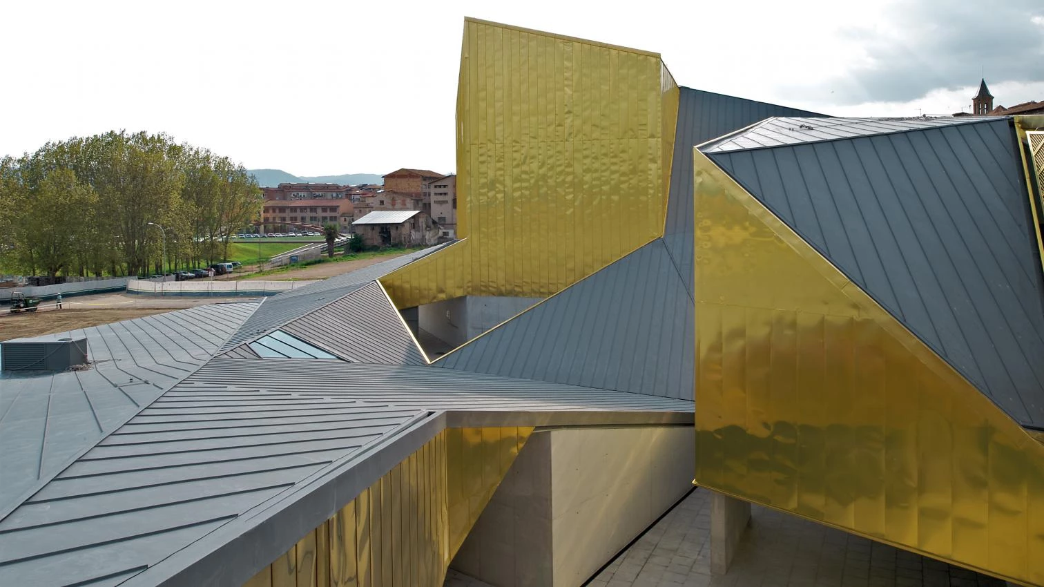 En 2002 cayó, víctima de aluminosis, el teatro Atlántida de Vic; ocho años después, Josep Llinás, Josep Llobet, Pedro Ayesta y Laia Vives han terminado el nuevo conjunto que lo sustituye, bautizado como Centro de Artes Escénicas de Osona, la comarca catalana cuya capital es Vic. Tres usos principales —un teatro de 800 plazas, un auditorio de entre 275 y 380 localidades y una escuela de música— comparten cubierta poliédrica de zinc y paredes de chapa de latón brillante color oro. El volumen de la caja escénica del teatro remata el crescendo de superficies trianguladas que logran encajar el edificio en una trama de transición entre el casco consolidado y los nuevos crecimientos de borde.