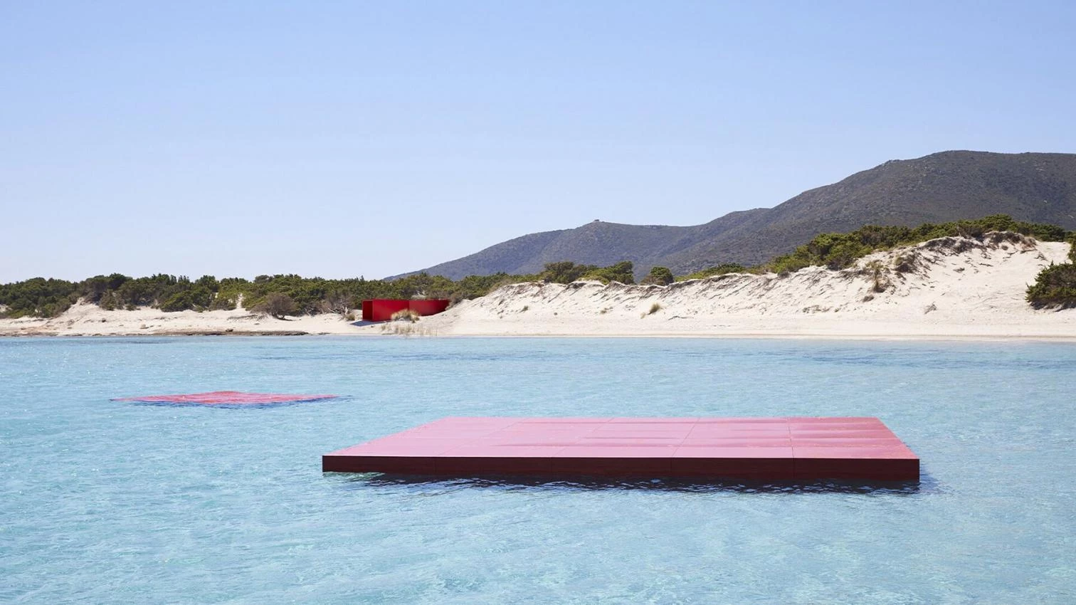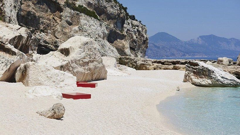 The Italian fashion house Prada presented its SS 2022 Menswear collection in a show with a catwalk designed by OMA / AMO. An imagined summer escape ended in an open-air space where nature and artifact interact, with a meandering red tunnel that models parade through and objects scattered on the sand and sea. The show was filmed in the ‘Deposito’ of Fondazione Prada in Milan and also in Sardinia. To thank the Sardinian community, Prada is supporting the Mediterranean Sea and Coast Foundation (MEDSEA) in reforesting Neptune grass (posidonia oceánica) meadows in the protected marine area of Cape Carbonara.