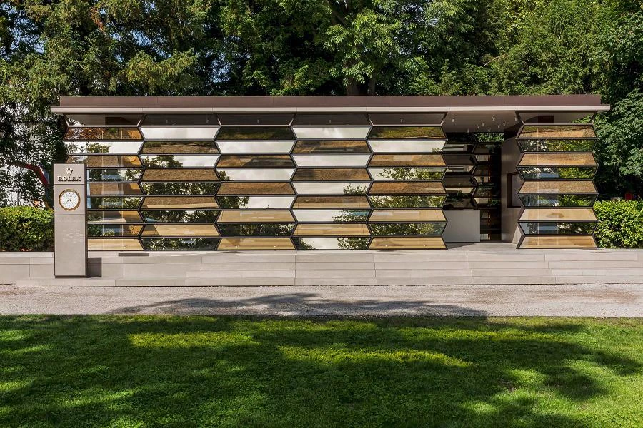 The Swiss watchmaker Rolex once again sponsors the Biennale, its fourth time since 2014, and takes part in the exhibition through a pabellón Rolex de los Giardini. Its design presents a solid base, a delicate transparent structure, and a faceted enclosure that recalls a striated bevel, a distinctive aesthetic feature of some of the brand’s most iconic watches.