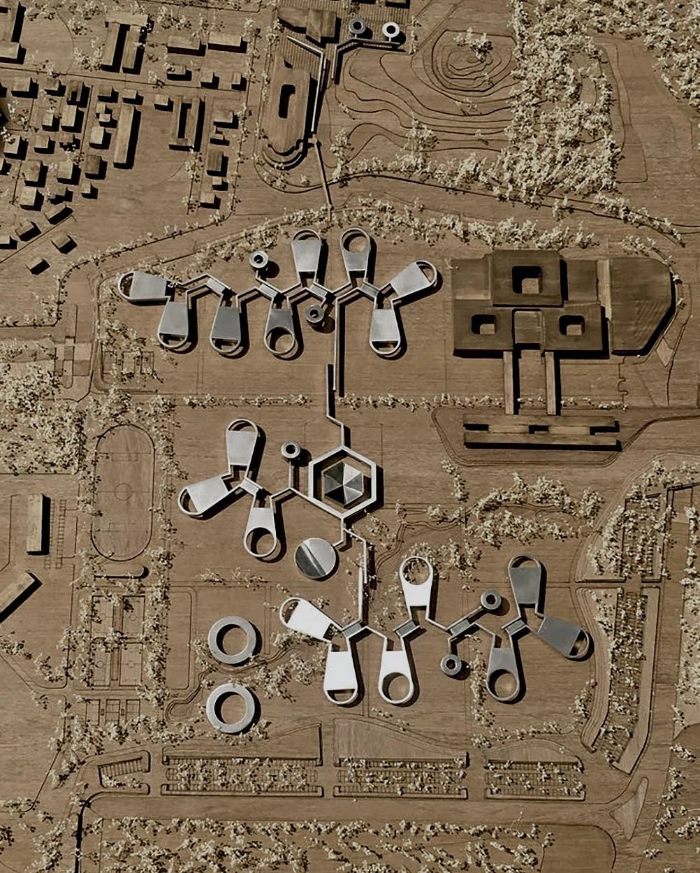 Among the exhibitions on show in Madrid this fall is ‘The Magritte machine,’ where Guillermo Solana presents the work of the Belgian artist recalling the fantasy of the painting machine to explore the method that allowed the artist to multiply the variants of his canvasses from a few motifs, and even generate them through a random and combinatorial game of addition, subtraction or permutation. Though far from surrealist poetics, it is tempting to identify a ‘Mazzanti machine’ to explain the composition procedures of the team gathered by the Barranquilla architect: be it children’s parks, sports venues, or the vast biomedical campus of Rome, the result does not come from a closed design, but from elementary modules combined by rules. Those are the fields – delimited in their dimensions and governed by rules as are sports competitions – on which the team plays, and those are the political and social contexts which frame the work of innovation and research of an architect who takes play very seriously.