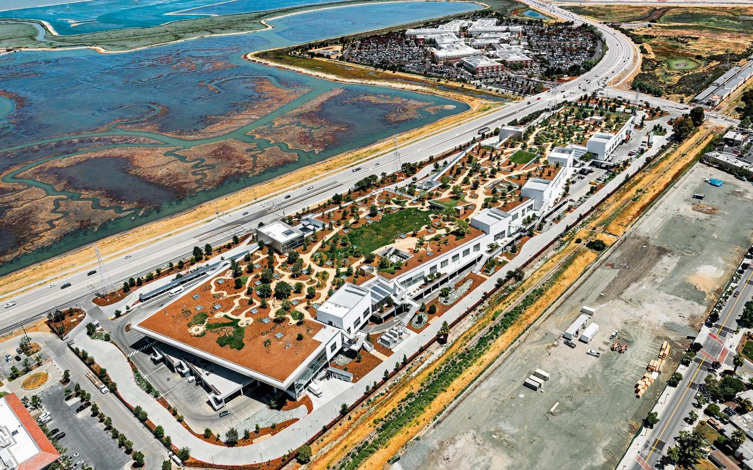 On what was the Sun Microsystems complex in Menlo Park, Frank Gehry has built for Facebook a randomly designed headquarters featuring the world's biggest work room, with space for 2,800 employees.