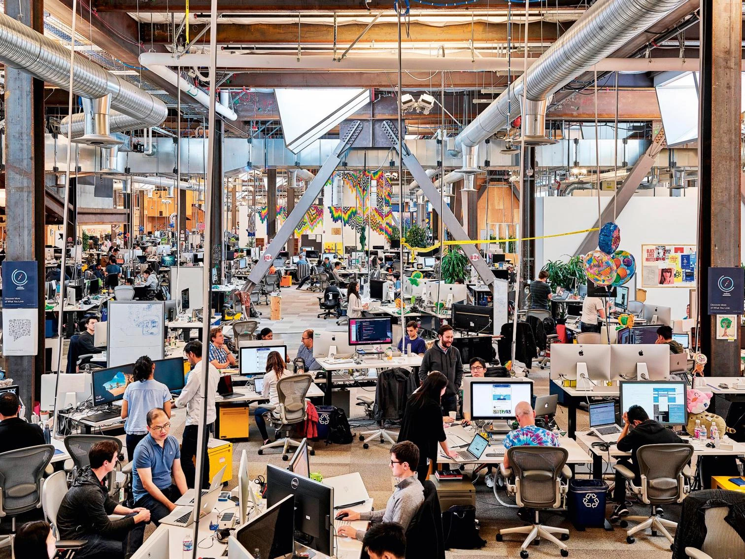 Like Google, Sun Microsystems was the product of a couple of Stanford graduate students. Started in 1982, it had 38,000 employees around the world by 2006. Four years later it had vanished. Zuckerberg bought the building when the company was sold to Oracle in 2010. Zuckerberg’s designers from a firm called Gensler treated a building that had won awards for its environmental efficiency when it was completed in 1996 as if it were an industrial dinosaur from the steam age. The driving principle for Zuckerberg was to have people work together in unplanned random interactions. Sun had planned their building around what it called an ‘internal street’. It’s the same metaphor that the Gensler team brought to the project. But Zuckerberg’s staff moved into a building that looked as if it had been occupied by upmarket squatters: there is graffiti art, installations, recycled furniture, and the annoyingly teenaged message ‘Move Fast and Break Things’ on the slogan-filled walls. By contrast, when IBM was in its pomp in the 1960s, walls were filled with Paul Rand’s elegantly crafted suggestions that demanded ‘THINK!’.