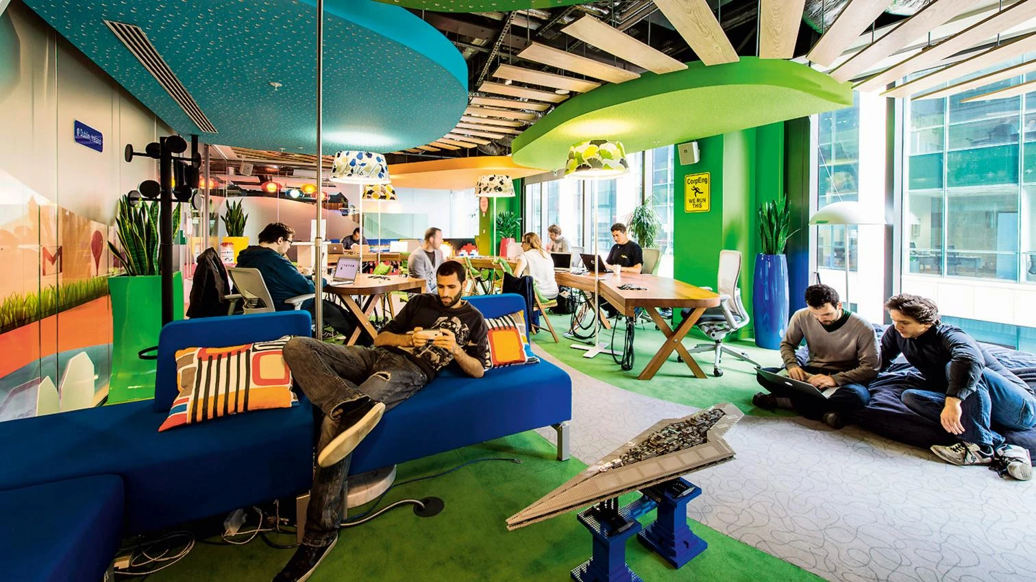 These are places that recall the scale of the huge ex-urban complexes of the East Coast that housed the bureaucrats who left New York for the suburbs. But the Silicon Valley behemoths are not cast in the traditional model of buttoned-down business cubicles. These are not offices or call centres, they are hothouses for creative minds. They are filled with brains that need careful nurturing. Those brains belong, mostly, to the young and the narcissistic. They demand in-house cycle repair shops to get their Pinarello fixed. They need beanbags and pizza windows; they need in-house resident artists. They need vegan food and tofu. They need to be able to interact with each other like crazy, all the time.