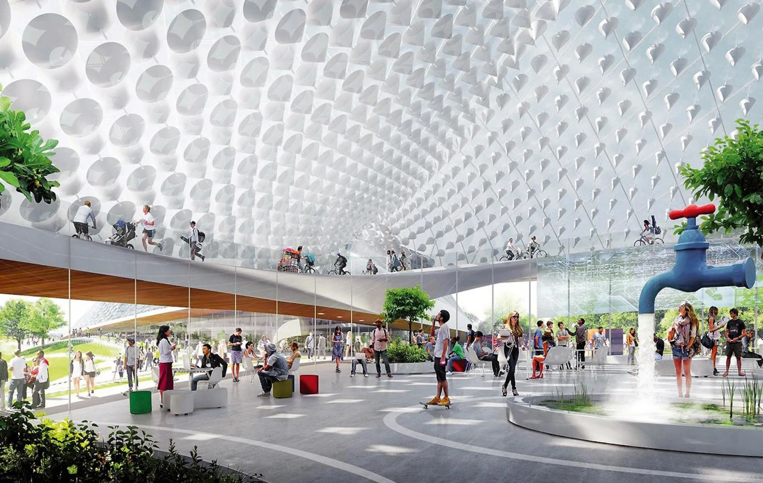 While Cupertino gave Apple permission to build its new HQ, Mountain View initially took a tougher line. It did not want to see itself turning into a single-company town. The Ingels/Heatherwick project was for a notional 2 million square feet. In consciously unconventional blue-sky thinking, robots that were ‘hackable’ would be used to create endlessly flexible customizable layouts. Google employees would work under artificial skies, giant bubbles that suggested lessons had been learned from Buckminster Fuller’s geodesic domes. But Mountain View said that it would consent to only 25 per cent of the scheme, and wanted to see LinkedIn take the rest of the space.