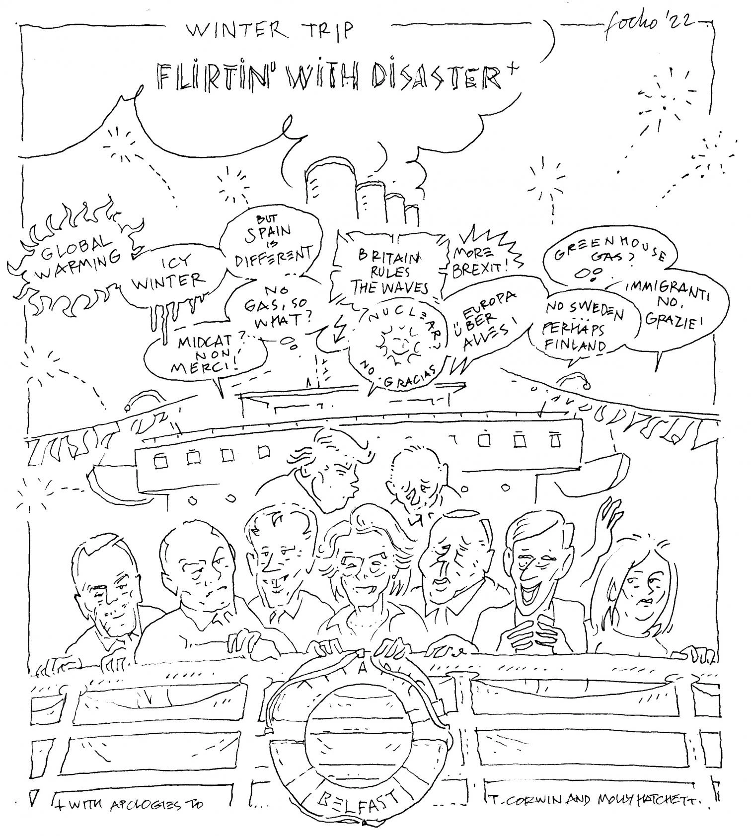 Like the Titanic but with no Viennese waltzes. In its Winterreise, this year Europe sails more to the beat of the Schubert cycle that with melancholy sings of isolation and cold. Isolation because of the disunity it is demonstrating to a world where Europe becomes less important by the day, with each country concentrated on its own problems and beset by populist specters sweeping through the continent from end to end. And cold because of the recession that makes even the strongest economies shiver, or more prosaically because of the shortage of Russian gas, a situation caused by the already chronic Ukraine war and in turn causing a general energy crisis sure to have freezing repercussions in homes. The winter of discontent has even blown away prime ministers (the Liz Truss who had made it into our cartoon needed to be quickly replaced), and after Brexit and the pandemic it presents itself as a new test for the European project. With so much background music going on, humanity’s biggest and most pressing challenge is drowned out, namely climate change, which in the summer (with never-before dog days in northern countries and wild fires in the Mediterranean) made it clear to us that its irreversible consequences demand a united and urgent response. Winter’s rigors may make us forget about summer’s heat, but it’s alarming that in this crossing there will be no icebergs.