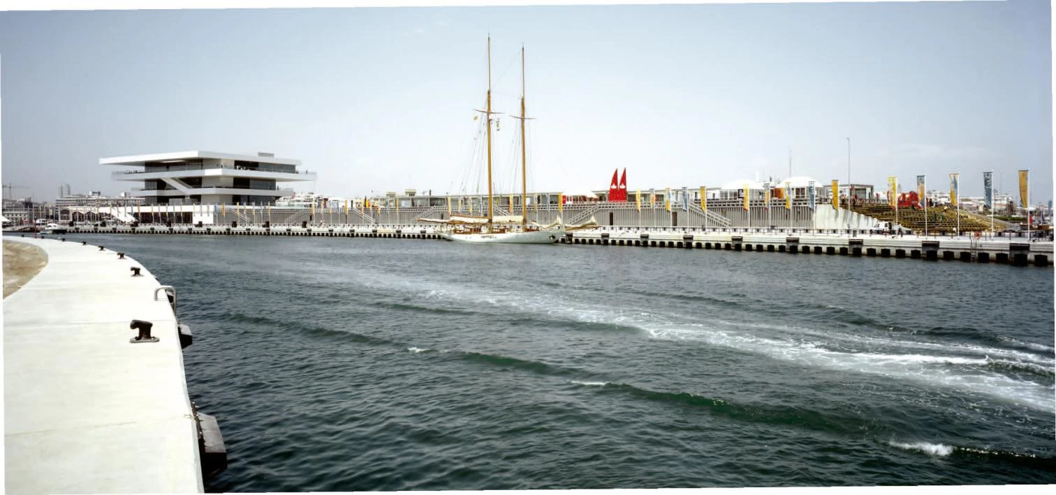 The Foredeck Building of the America’s Cup, also called Veles e Vents, is formed by cantilevered platforms that frame the views and protect visitors and spectators from the sun, rising in the dock like an abstract landmark.