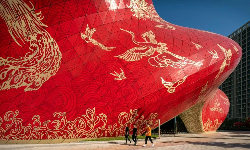 An image opens on my screen: a 2,000-seat theatre on the edge lands of Guangzhou, a territory of raw new towers and just-departed rural ghosts, designed to look like a swirl of red silk, imprinted with “tattoos” of phoenixes, cranes and other ornithology. It refers, goes the explanatory text, to Guangzhou’s historic role as “the birthplace of the silk road on the sea”. It is a declaration of something where there was formerly nothing, a three-dimensional advertisement for the colossal Sunac Wanda cultural tourism city of which it is part. I peer at the image – is it virtual or real? It’s real.