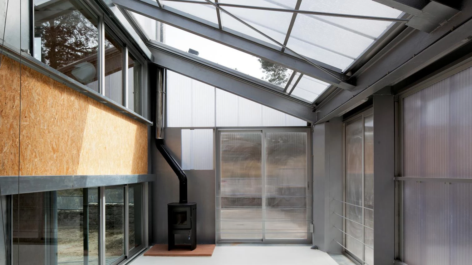 El uso de técnicas de construcción seca permite acelerar los tiempos de obra, reducir los costes y dotar al edificio de una mayor flexibilidad a la hora de hacer cambios en un futuro. Los acabados son los de los materiales industrializados en el caso de los cerramientos; los suelos consisten en una capa continua de pintura epoxi. Las instalaciones se dejan vistas. Finalmente, la cubierta de la zona habitada es de tipo vegetal: se planta una pradera que restituye en cierta manera la porción de jardín que ocupa la edificación y que permite disfrutar de un espacio a la altura de las copas de los árboles y con vistas a las montañas.