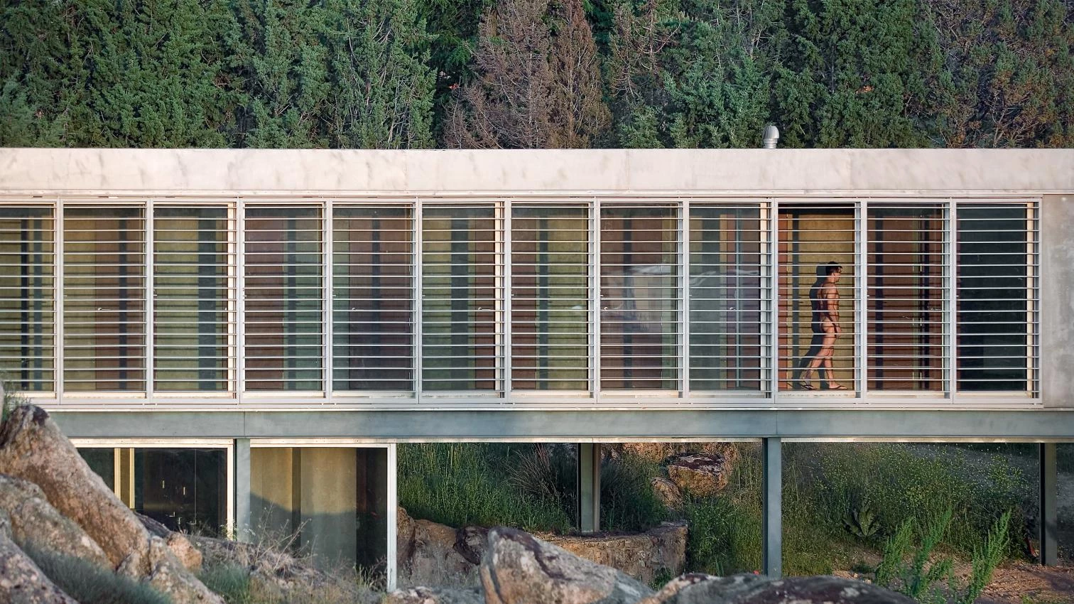 Situada en las inmediaciones del Parque Natural del Guadarrama Medio, en Madrid, la Casa Lagartija, proyectada por Alberto Pieltáin, se asemeja a un vagón de tren, estrictamente modular, que se hubiese quedado detenido entre dos crestas paralelas de roca viva. Concebida como una casa de fin de semana, el edificio se organiza en dos niveles, si bien la planta baja apenas manifiesta su huella sobre el terreno, al estar apoyada sobre esbeltos pilares metálicos y muretes de mampostería que dotan a la casa de un acceso al nivel de la calle. Es el rotundo volumen prismático de la planta principal, por tanto, el que cobija la mayor parte del programa doméstico, desde la zona de acceso enrasada con la plataforma superior del terreno hasta el resto de zonas vivideras, organizadas a lo largo de una galería que se abre a las magníficas vistas circundantes, definidas por la presencia profusa de encinas, bolos de granito y monte bajo. Por lo demás, el elenco de colores y materiales empleados en la casa es muy escueto (tableros de madera-cemento, wengé o chapas plateadas), cuyos tonos y texturas resuenan con los característicos del entorno.