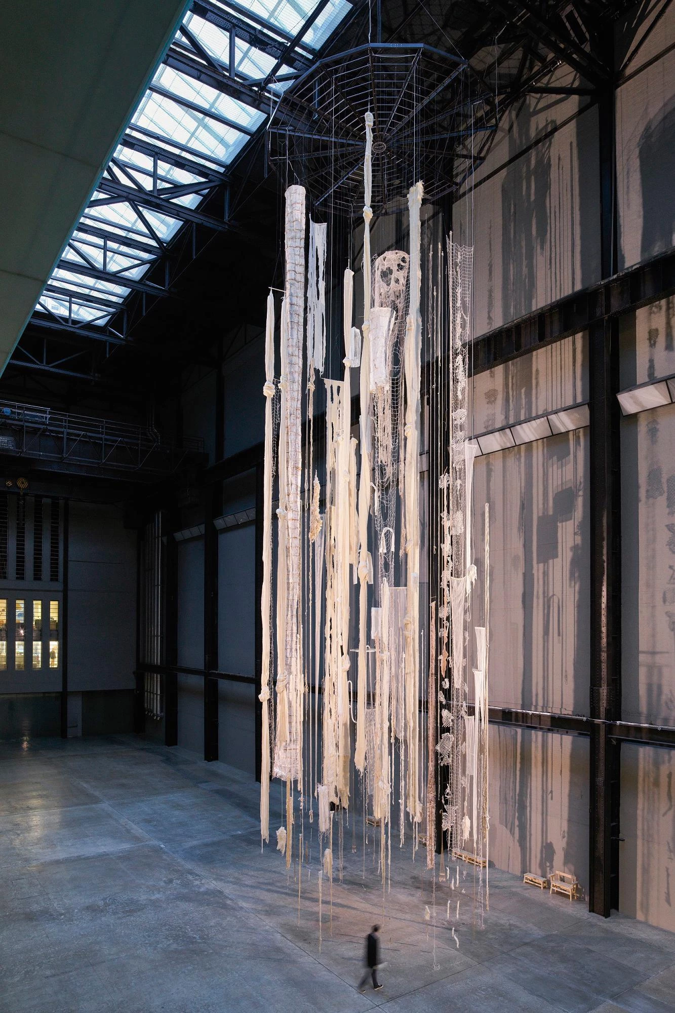 De una araña a un sol, de una grieta a un mar de pipas de girasol, la Sala de Turbinas de la Tate Modern acoge desde el año 2000 una instalación que como en pocas ocasiones puede adquirir un gigantesco formato y que es para su autor uno de los encargos más prestigiosos que puede recibir un artista. El honor ha recaído este año en la chilena Cecilia Vicuña, quien ha concentrado todas las líneas de su práctica en una obra que —tal y como lleva haciendo desde hace medio siglo— ha trasladado su activismo al seno de un museo. Largos jirones confeccionados con fibras de yute y cáñamo, en los que se entretejen desechos rescatados del Támesis por mujeres de la comunidad latina local, se tiñen de blanco hueso para simular un gran árbol desecado por las sequías y penden del techo remitiendo a su vez a los quipus andinos. La causa ambiental y la lucha de los pueblos indígenas se impregnan además con su querencia por la palabra y el paisaje sonoro, traducido en un montaje del compositor colombiano Ricardo Gallo a base de música, voces y sonidos naturales que hacen vibrar el espacio con el choque entre el mundo humano y la Tierra.