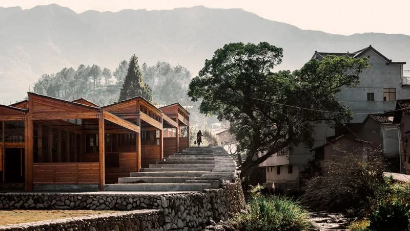 In the remote Chinese village of Caizhai, a series of wooden pavilions step down a slope next to a babbling brook, their pitched tiled roofs echoing the rocky peaks of the mountains behind. Through big picture windows, day-trippers look inside, watching big barrels of soya make the journey from bean to tofu, passing through different rooms for soaking, grinding, pressing and frying, in a mesmerising parade of beancurd production...