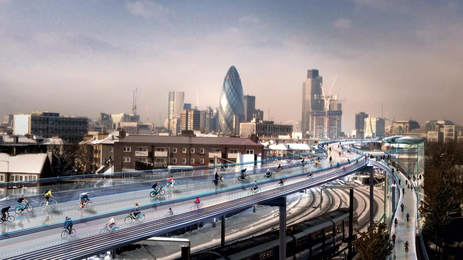 Reciclar grandes infraestructuras para darles una segunda vida no es algo novedoso. Son muchos los proyectos que han convertido redes de distribución de energía o trazados ferroviarios en nuevos espacios urbanos. Pocos hay, sin embargo que, en vez de desmontar la vieja dotación, la mantienen en uso y garantizan su viabilidad con nuevas funciones. Este es, precisamente, el caso de la propuesta que Norman Foster, en colaboración con Space Syntax y el estudio de paisajismo Exterior Architecture, acaba de presentar tras un desarrollo de dos años: superponer al trazado existente de metro en superficie de Londres —unos 220 kilómetros de vías— un carril superior destinado a la circulación rápida de bicicletas. La nueva red daría servicio a unos 6 millones de personas, la mitad de los cuales vivirían y trabajarían a menos de 10 minutos de los 200 puntos de acceso —rampas o plataformas hidráulicas— que tendría la dotación, y que conectarían la cota variable del suelo con una vía a 15 metros de altura, sostenida por una estructura independiente a la del ferrocarril. Con la intervención, Foster estima que podría asumirse un tráfico de 12.000 ciclistas a la hora, con un ahorro unitario derivado de 30 minutos de jornada laboral. Se ha anunciado además que la propuesta, que está siendo estudiada por el Ayuntamiento de Londres, tendrá nuevas versiones en París y otras ciudades europeas.