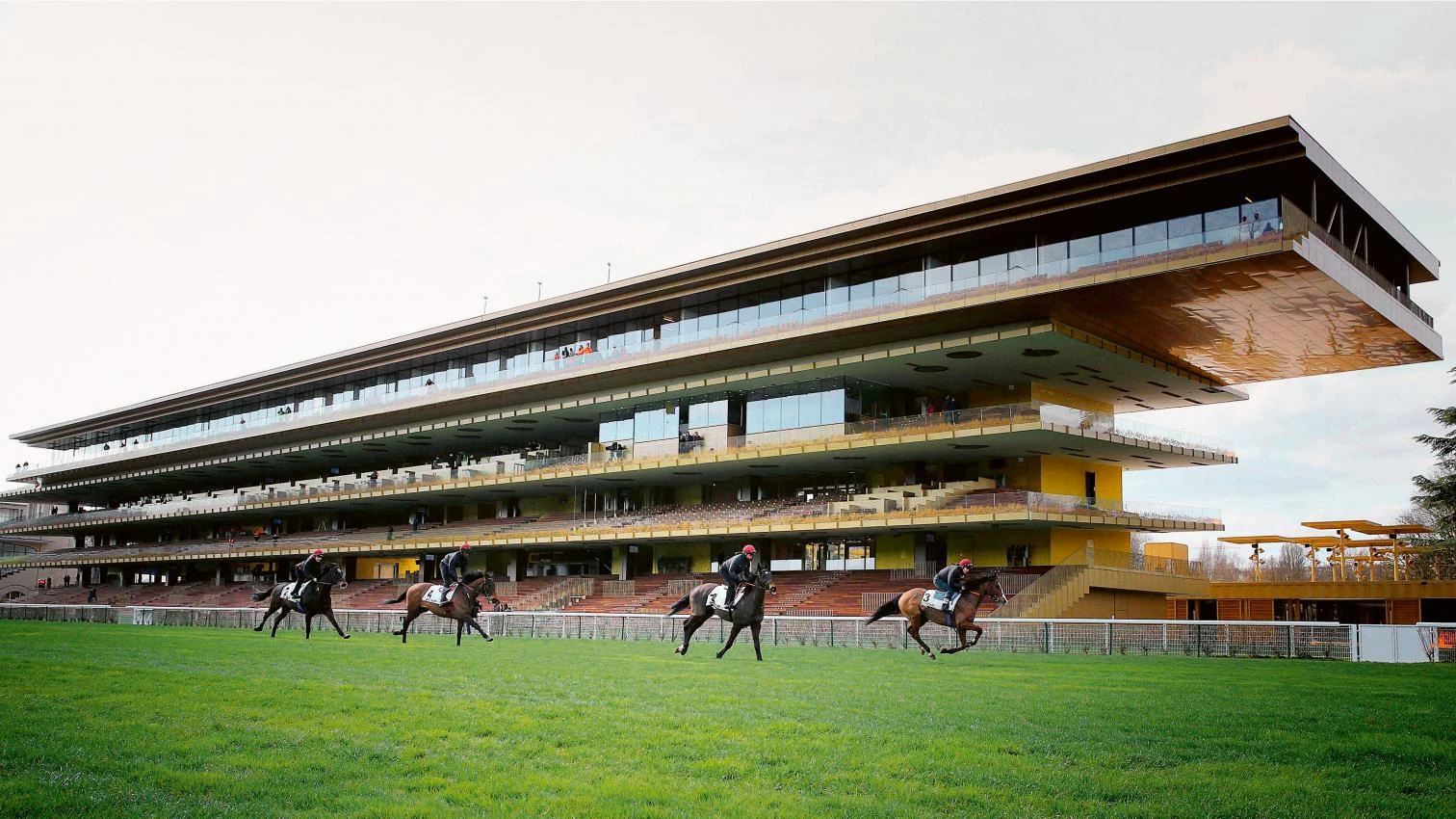 Concebido como una pila de grandes plataformas que, merced a su acusada inclinación, procuran buenas vistas sobre las carreras, el nuevo edificio principal del hipódromo parisino sigue, en lo fundamental, las directrices establecidas en el concurso internacional que en 2011 ganó Dominique Perrault. No sólo porque la estrategia de apilamiento le dé su singular carácter al edificio, sino también porque le dota de panoramas abiertos y cruzados, y protege a los usuarios del viento y el sol, amén de dar cuenta de los que quizá hayan sido los dos mayores retos a los que tuvo que responder el proyecto: de un lado, hacer posible que el nuevo conjunto se relacionara adecuadamente con su singular entorno verde; del otro, integrar edificios de distintas épocas y a diferentes cotas en una sola imagen poderosa que fuera reconocible desde el frente del cercano río Sena.