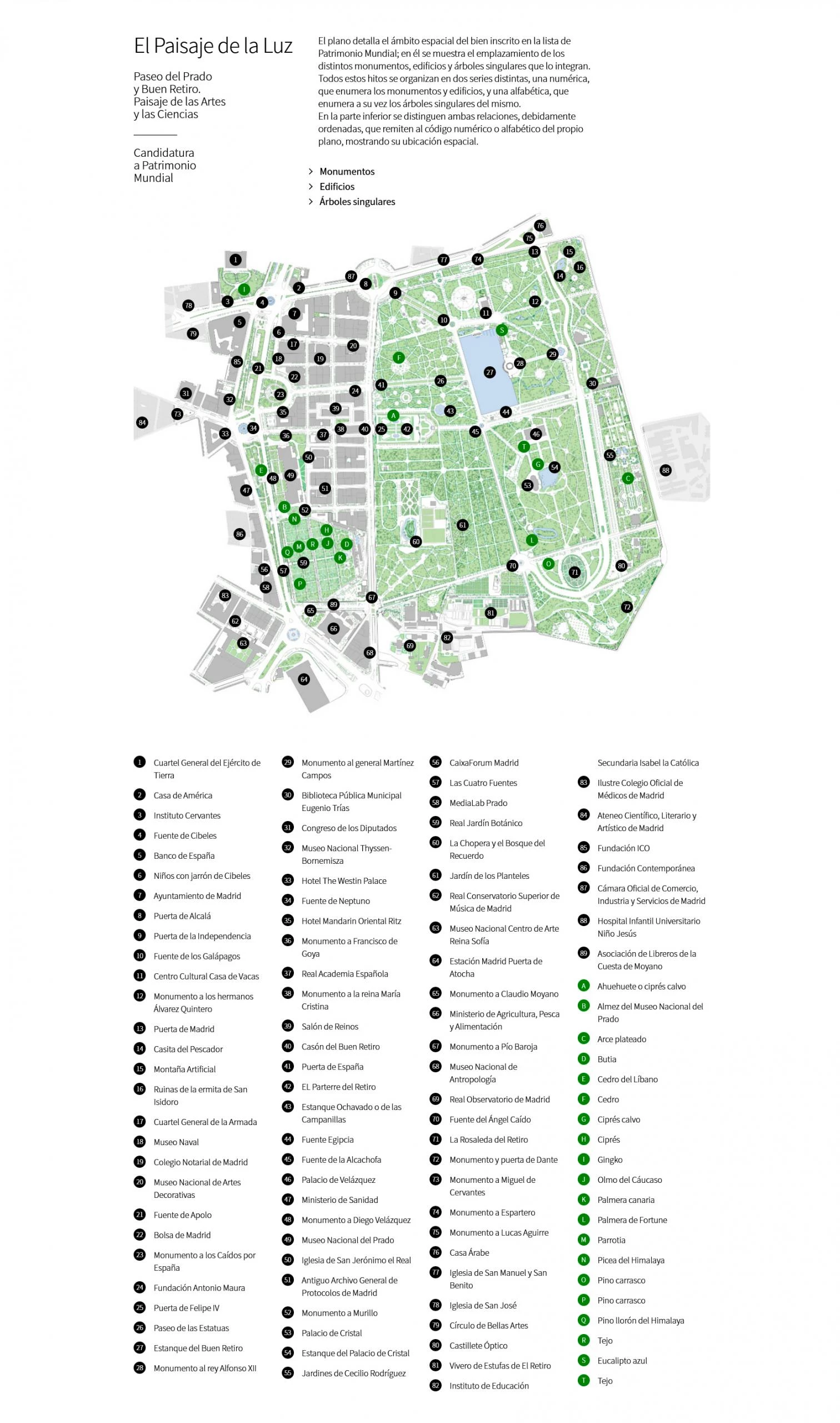 La Unesco otorga valor universal, en la categoría de Paisaje Cultural, al conjunto urbano donde se articulan el parque del Retiro y el paseo del Prado, cuya candidatura fue presentada bajo el lema Paisaje de la Luz. El ámbito premiado incluye seis museos, se originó en el siglo XVI y es el primer paseo arbolado de Europa, y el primero del mundo de uso público, que ha conseguido entrar en la lista del Patrimonio Mundial de la Unesco.