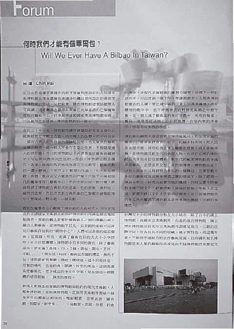 En su número de agosto de 1999, Dialogue se preguntaba: ‘Will we ever have a Bilbao in Taiwan?’ La revista de arquitectura de Taipei dedicaba su portada a las formas fracturadas del museo Judío de Daniel Libeskind, e imprimía el interrogante de su Forum sobre una fotografía del Guggenheim de Frank Gehry, tras un editorial en el que su director reclamaba para la isla un museo como los de Libeskind en Berlín, Gehry en Bilbao o Zaha Hadid en Cincinnati, cuyos volúmenes inestables juzgaba óptimos para llamar la atención del público, suscitar demanda turística y dinamizar la economía de las ciudades correspondientes. Un mes más tarde, un devastador terremoto causaba millares de muertos y sembraba las ciudades de Taiwan con edificios quebrados que en las fotos de prensa podían confundirse con proyectos deconstructivos, en una trágica y dolorosa paradoja que suscita una reflexión melancólica.