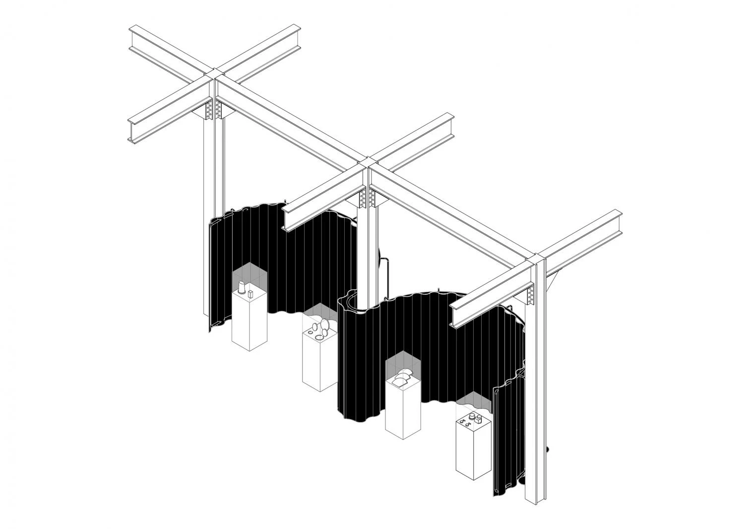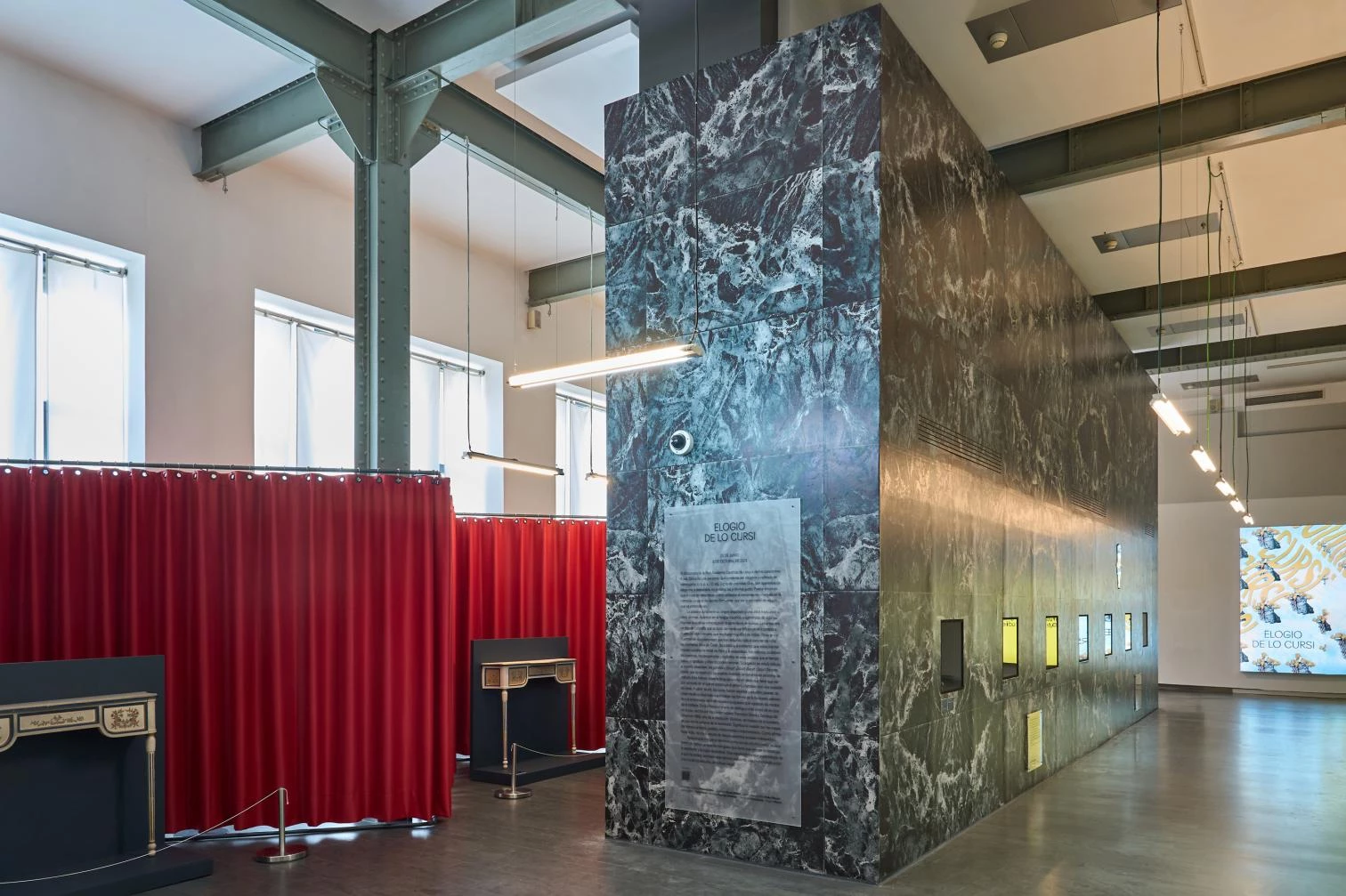 - Dos dobles nichos de cortinaje, diseñados con una estructura de perfiles de acero tubular inspirados en la estructura de la silla Weissenhof y los diseños de Lilly Reich. Lacados en gris antracita y que suspenden unas cortinas que lejos de materializarse con el terciopelo granate de Mies/Reich se materializan en una tela de raso vulgar.