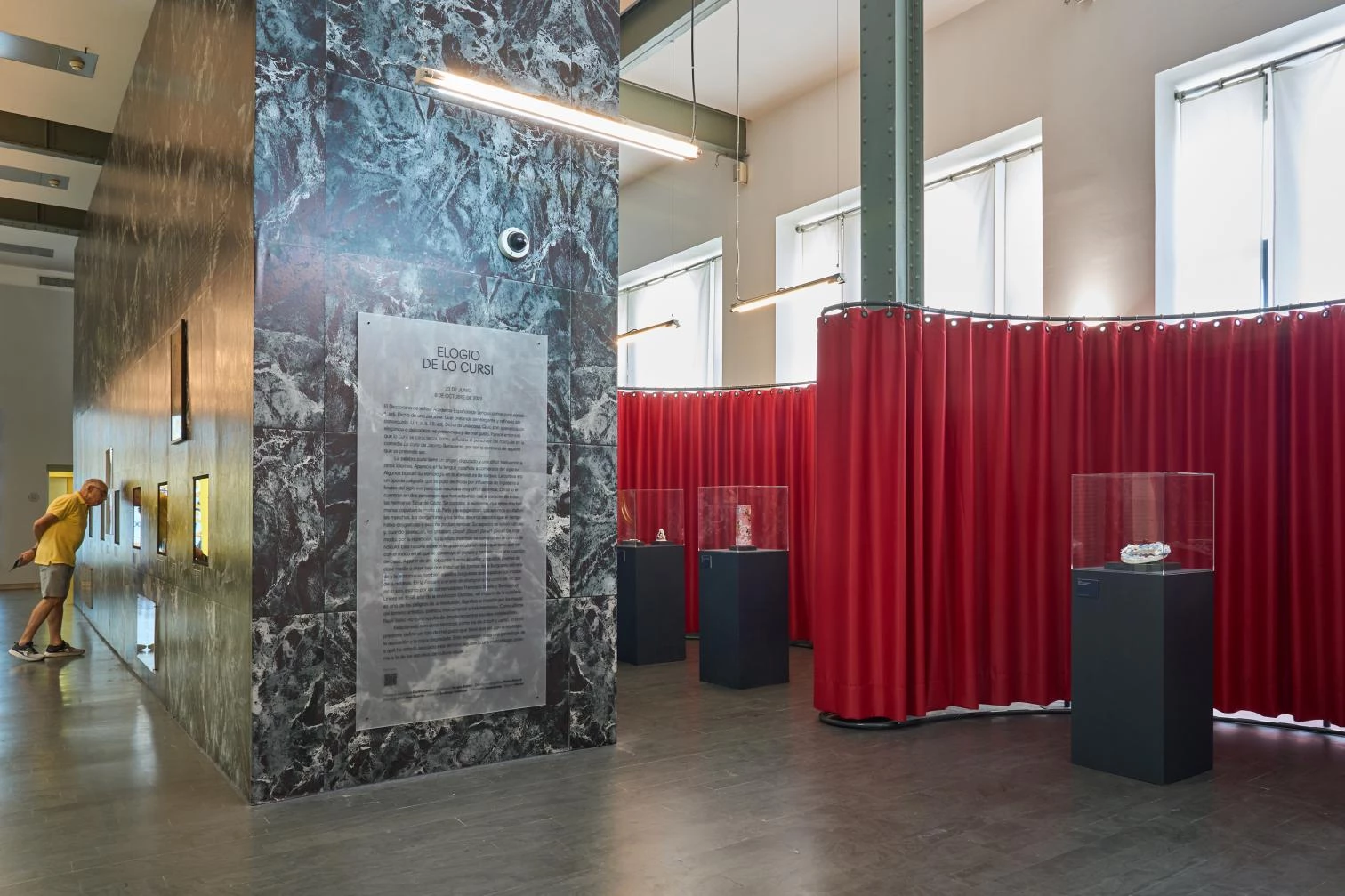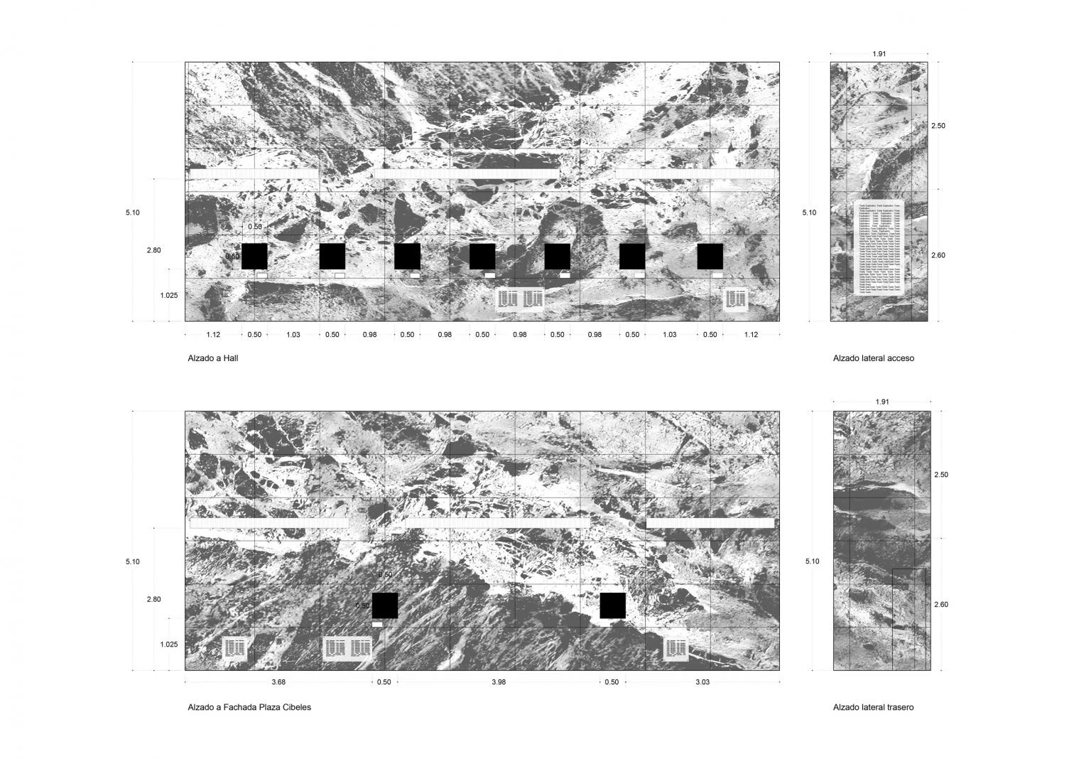Desde esa ironía, el proyecto toma el patrón del mármol del Pabellón Barcelona, así como la modulación de los dos monolitos interiores de la Neue Nationalgalerie de Berlín, para recrear dos prismas simétricos en ambas alas del Palacio Cibeles, lugar de la exposición.