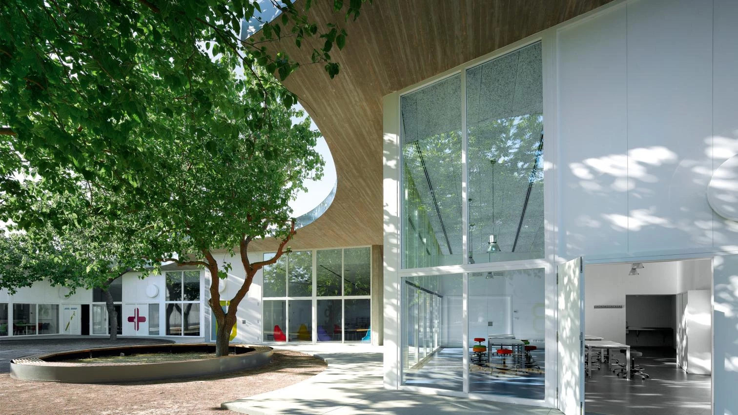 El nuevo edificio para la Universidad Popular Infantil de Gandía (Valencia), diseñado por los madrileños Ángela García de Paredes e Ignacio García Pedrosa, parte de una premisa singular y razonable: preservar a seis moreras que ya existían en el parque Ausias March, donde se ubica la nueva construcción. El edificio, que alberga una serie de talleres experimentales donde los niños de hasta doce años pueden ampliar sus conocimientos artísticos, consta de una piel cerámica cuya forma rectilínea contrasta con el trazo sinuoso con que la parte interior se va adaptando a la posición de los árboles, generándose de esta manera un patio destinado al ejercicio de actividades al aire libre.